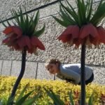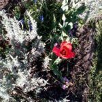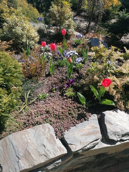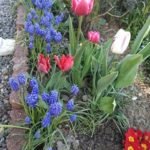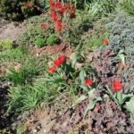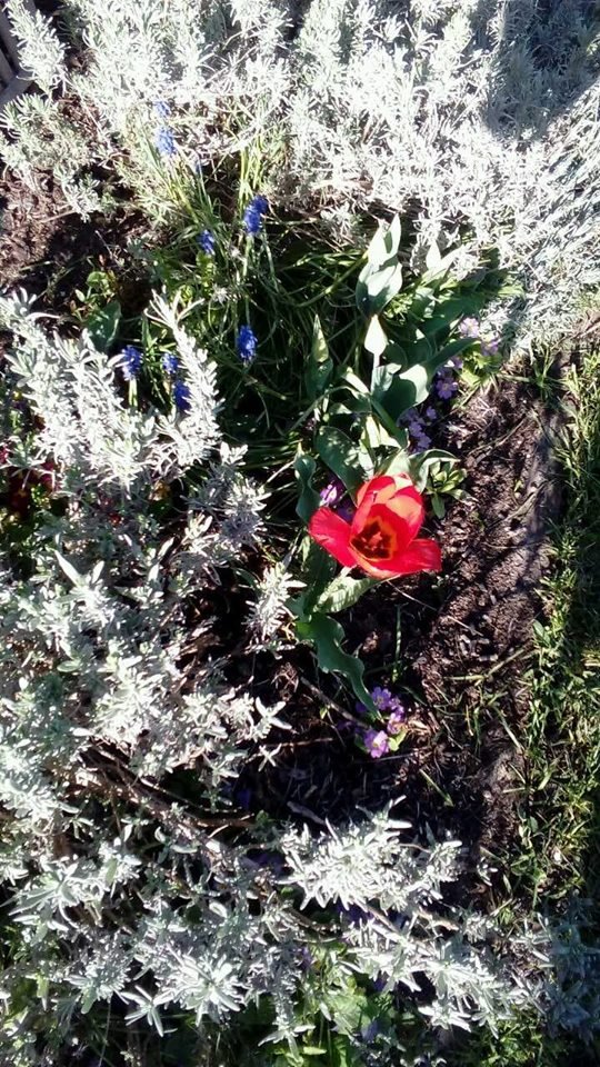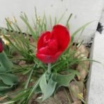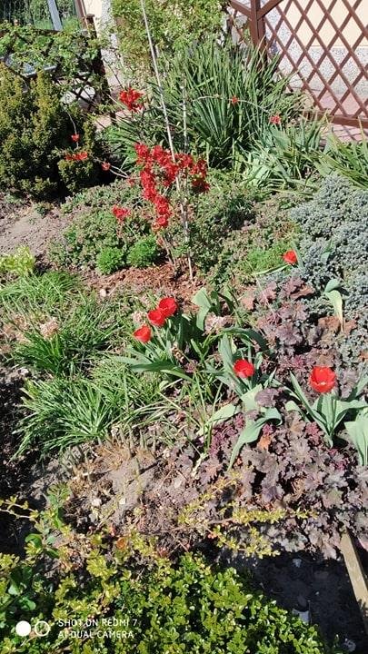 W rogu rabatki tulipan się czerwieni,