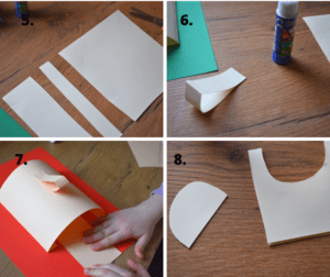 - Bierzemy drugą połowę kartki i wycinamy dwa paski. Szerszy na szyję i cieńszy na nos.