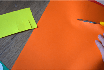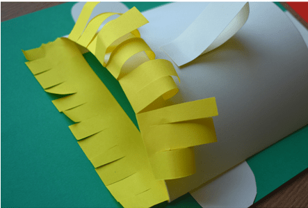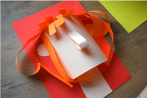 Wracając do naszej pracy plastycznej, a konkretnie do włosów. Dziecko wybiera kolor kartki, wycina pasek i nacina go. W ten sposób można zrobić grzywkę. Na zdjęciach możesz zobaczyć jak przykleić taką grzywkę do twarzy 3D. Wycinamy paski o dowolnej długości i przyklejamy obok twarzy(jeśli chcemy możemy zrobić nawet kręcone włosy Nie możemy zapomnieć o ustach i oczach. Usta można narysować flamastrem lub wyciąć z kolorowej kartki. Oczy wycinamy z białej kartki i przyklejamy.