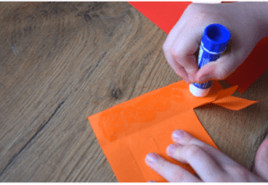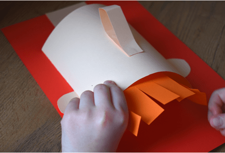 - Cienki pasek składamy na pół i sklejamy jego końce. Palcami zaginamy „czubek nosa”.