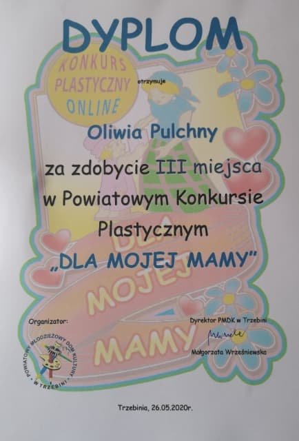 Tak pracujemy.. Posted on: 15 maja 2020 by: AW Gratulacje dla Oliwki za zajęcie III miejsca w konkursie powiatowym ,,Dla mojej mamy”!!!
