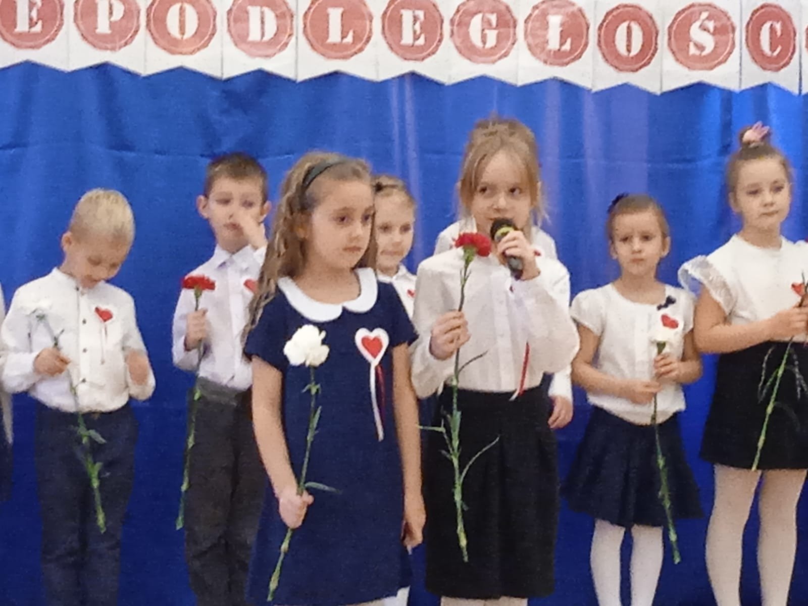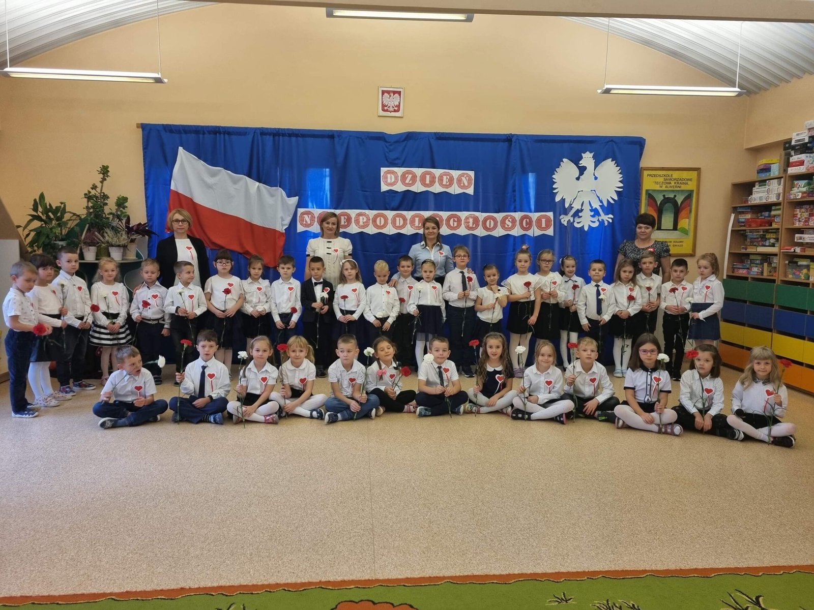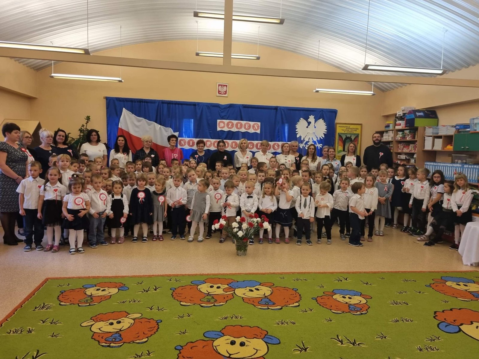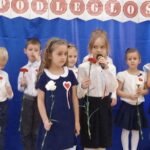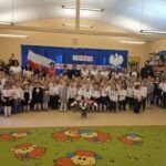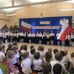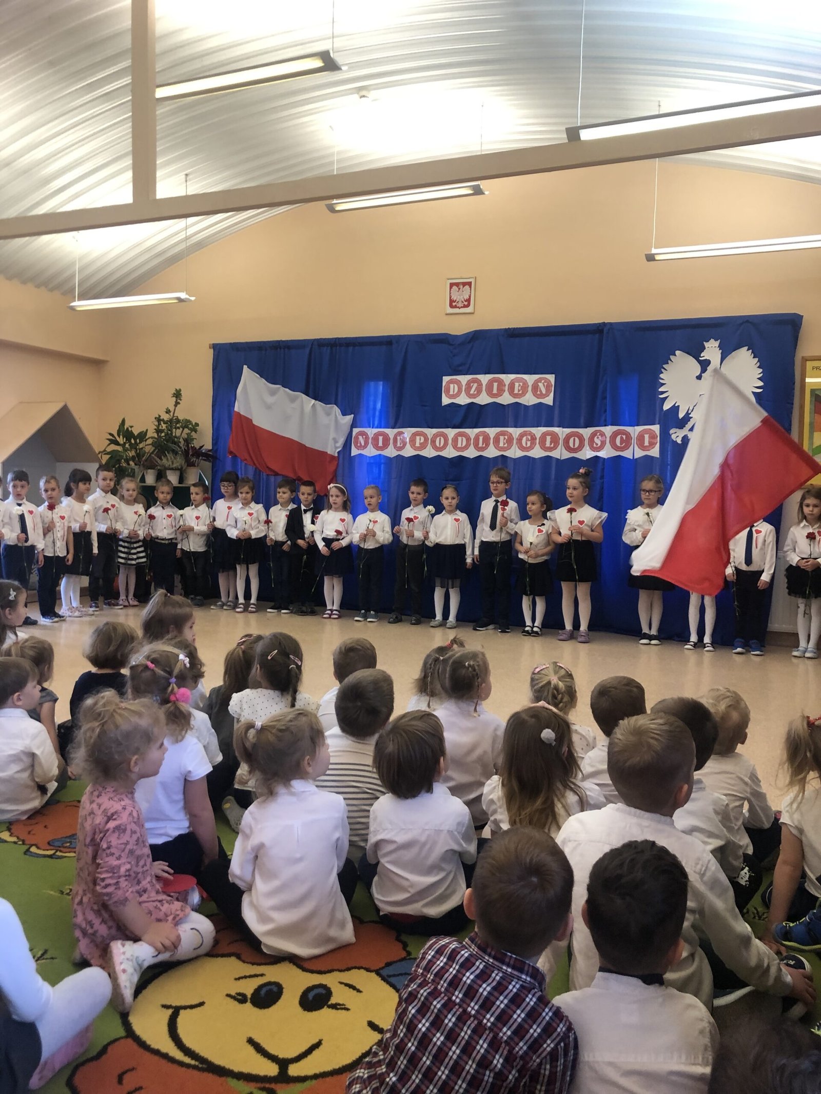Z okazji Dnia Niepodległości starszaki przygotowały uroczystą akademię , na którą zaprosiły młodszych kolegów i koleżanki oraz personel przedszkola. Z dumą i wielkim zaangażowaniem zaprezentowały wiersze i piosenki upamiętniające to doniosłe wydarzenie. Wspólnie odśpiewaliśmy hymn Polski .