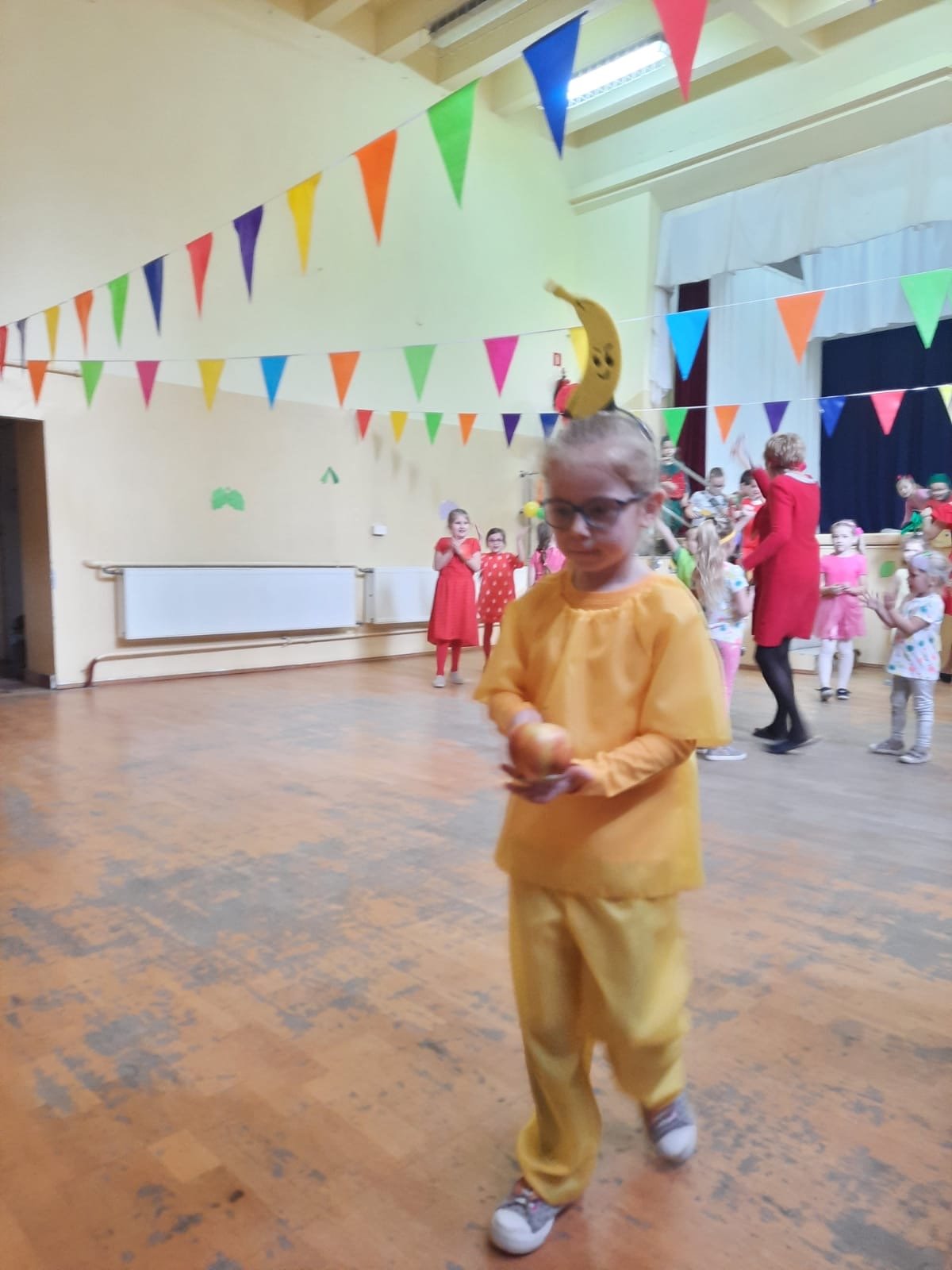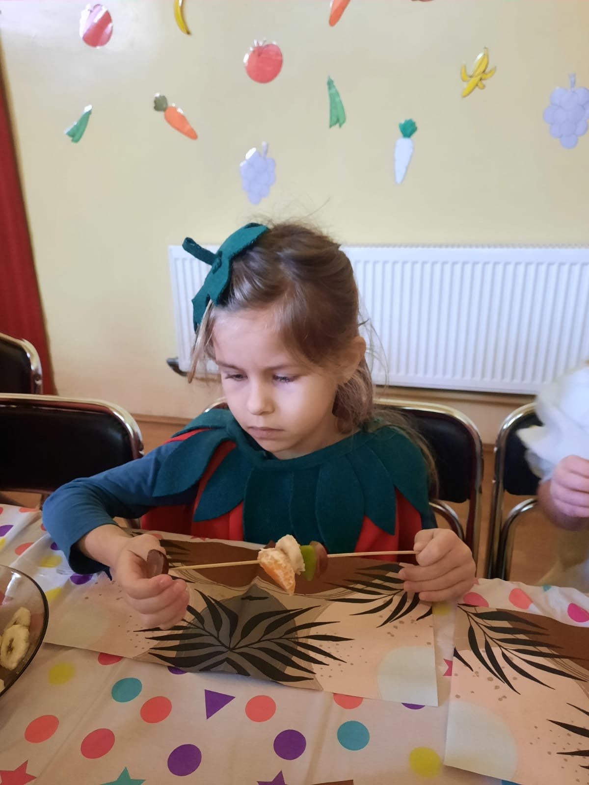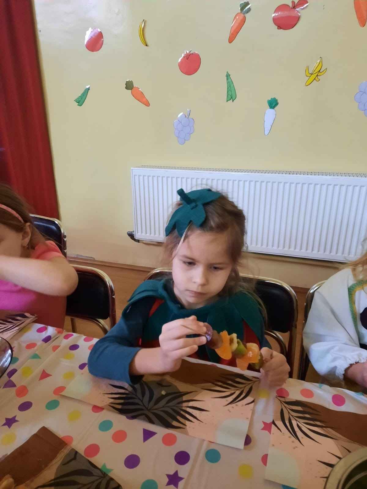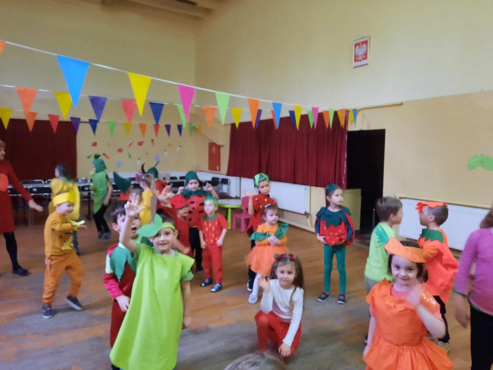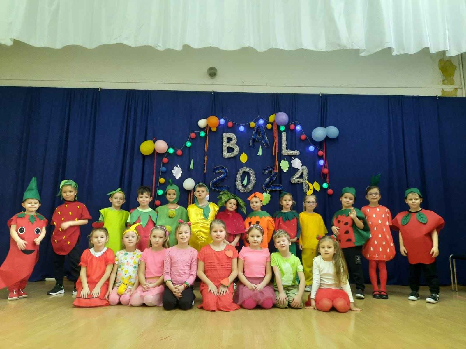Tego dnia dzieci prezentowały się w owocowo-warzywnych strojach. W czasie balu przedszkolaki wysłuchały bajki „O księżniczce Zuzance i rycerzu Witaminku”. Wzięły udział w zabawach, konkursach sprawnościowych. Dzieci bawiły się i tańczyły przy znanych i lubianych piosenkach o tematyce warzywno-owocowej. Szczególną atrakcją dla dzieci okazały się owocowe szaszłyki, które wykonały samodzielnie. Było kolorowo,wesoło,smacznie i zdrowo.