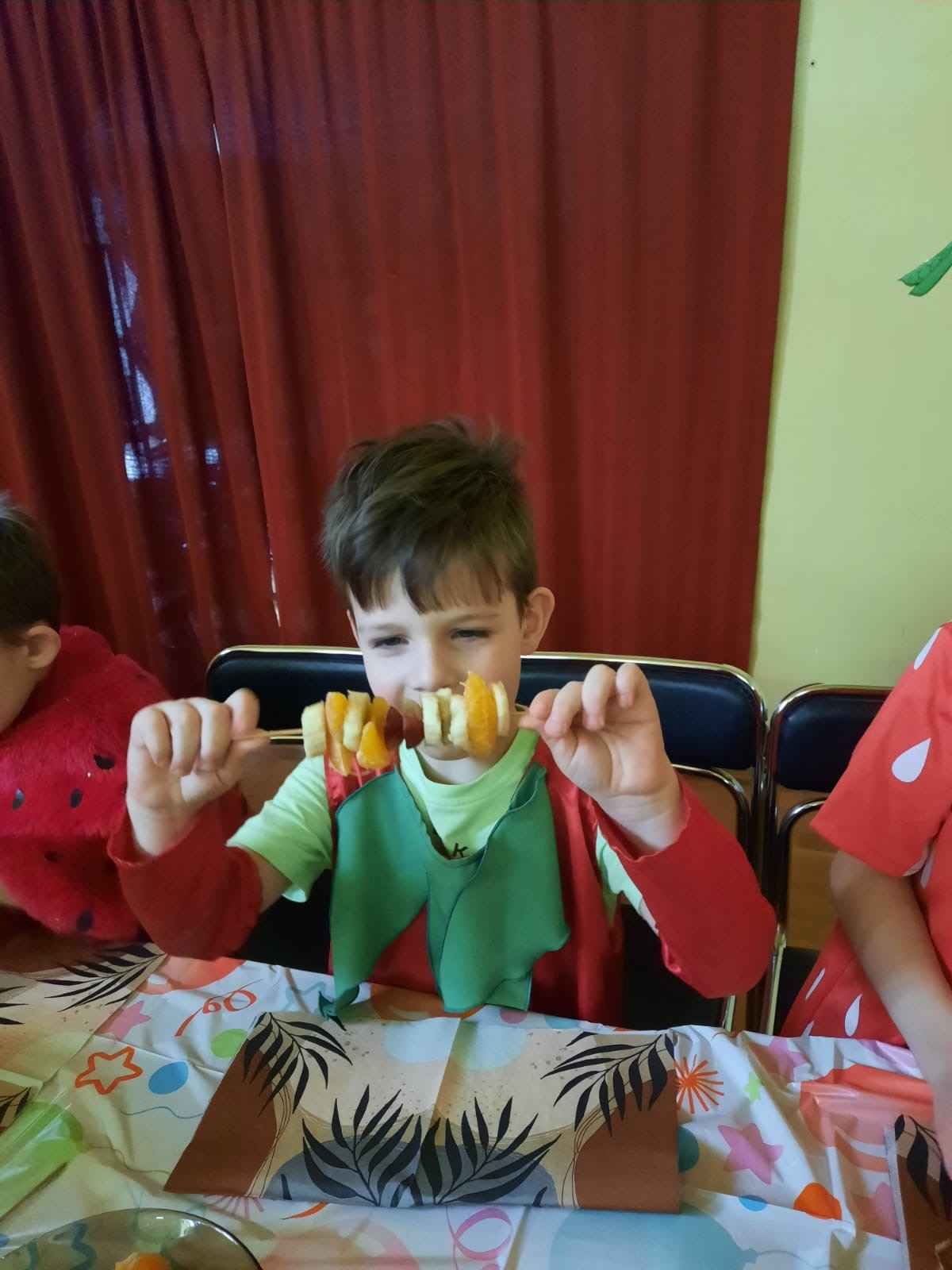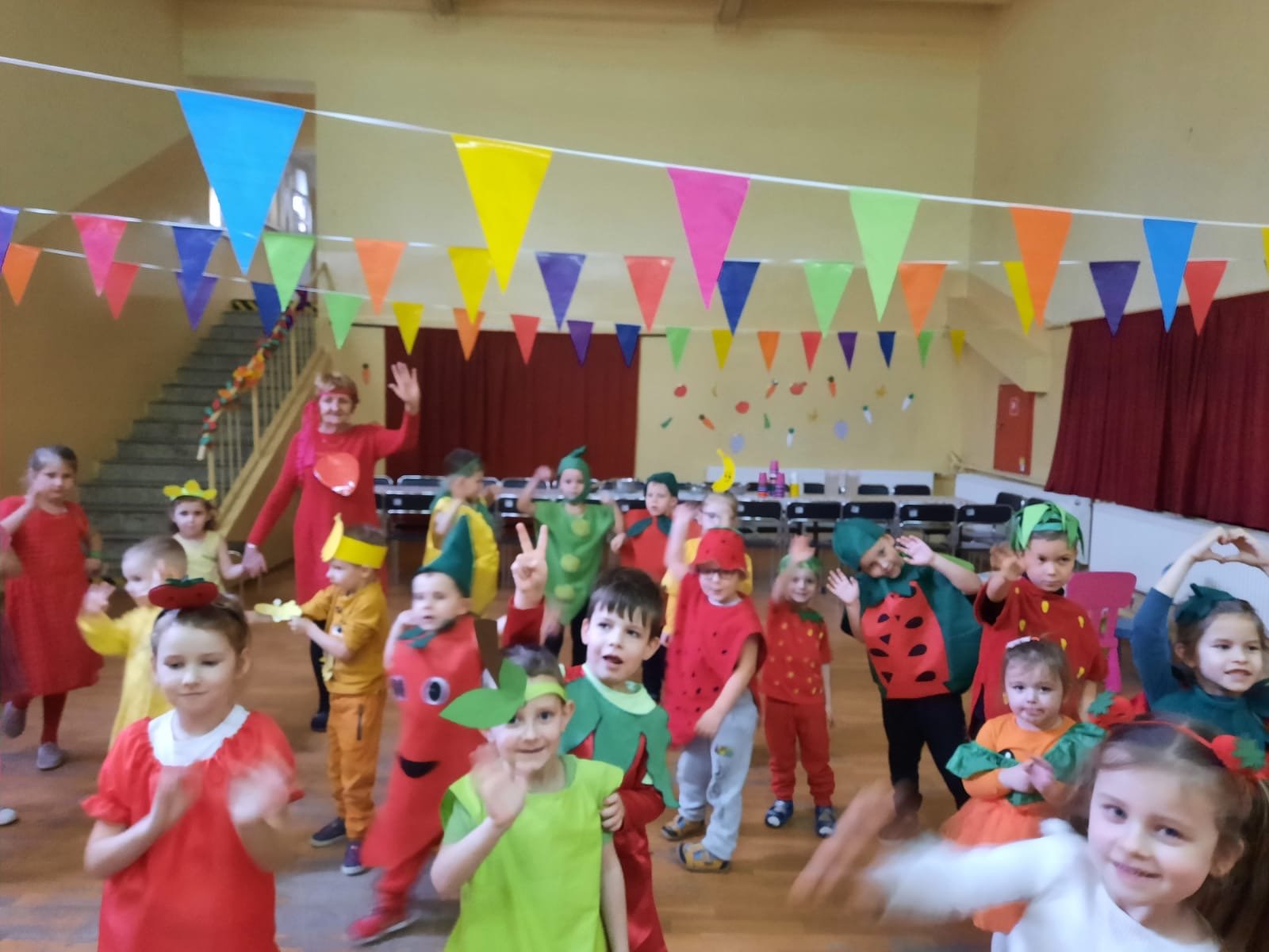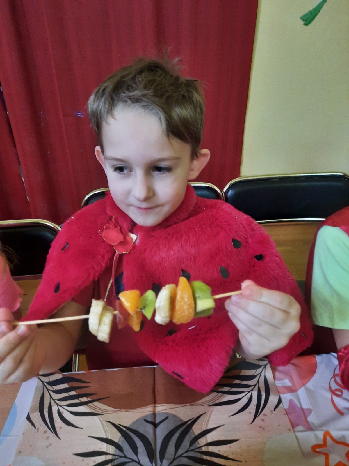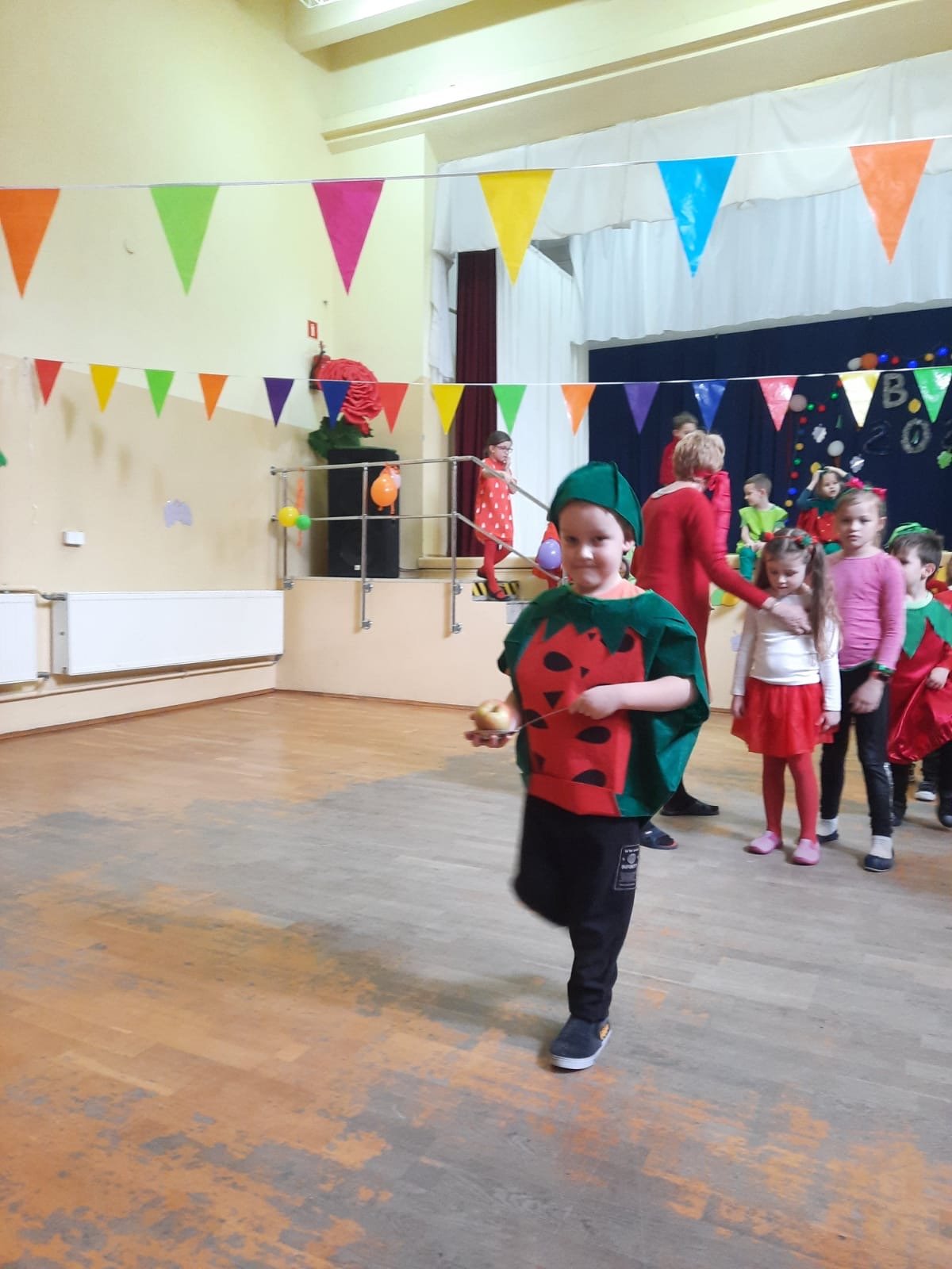 Tego dnia dzieci prezentowały się w owocowo-warzywnych strojach. W czasie balu przedszkolaki wysłuchały bajki „O księżniczce Zuzance i rycerzu Witaminku”. Wzięły udział w zabawach, konkursach sprawnościowych. Dzieci bawiły się i tańczyły przy znanych i lubianych piosenkach o tematyce warzywno-owocowej. Szczególną atrakcją dla dzieci okazały się owocowe szaszłyki, które wykonały samodzielnie. Było kolorowo,wesoło,smacznie i zdrowo.