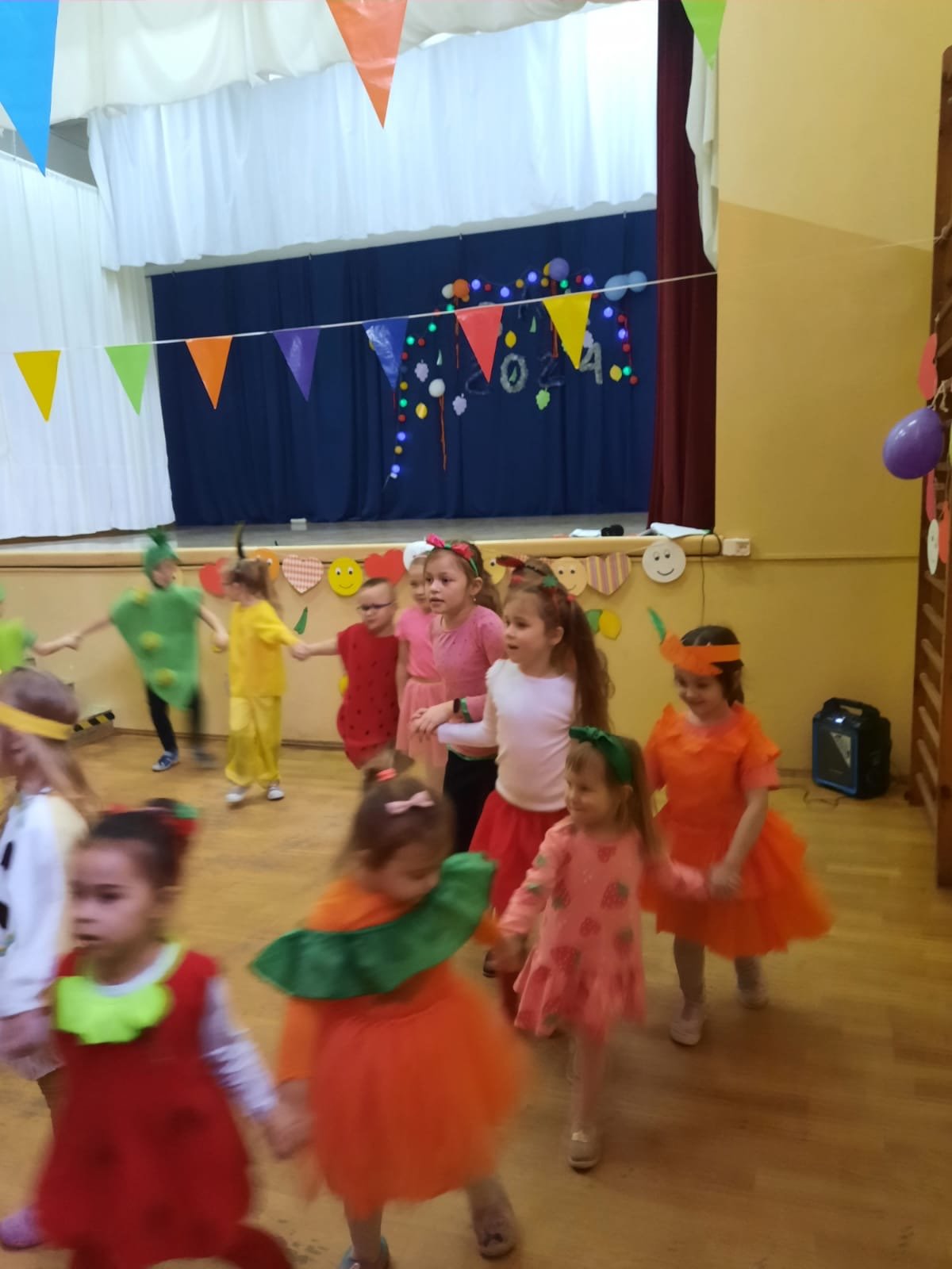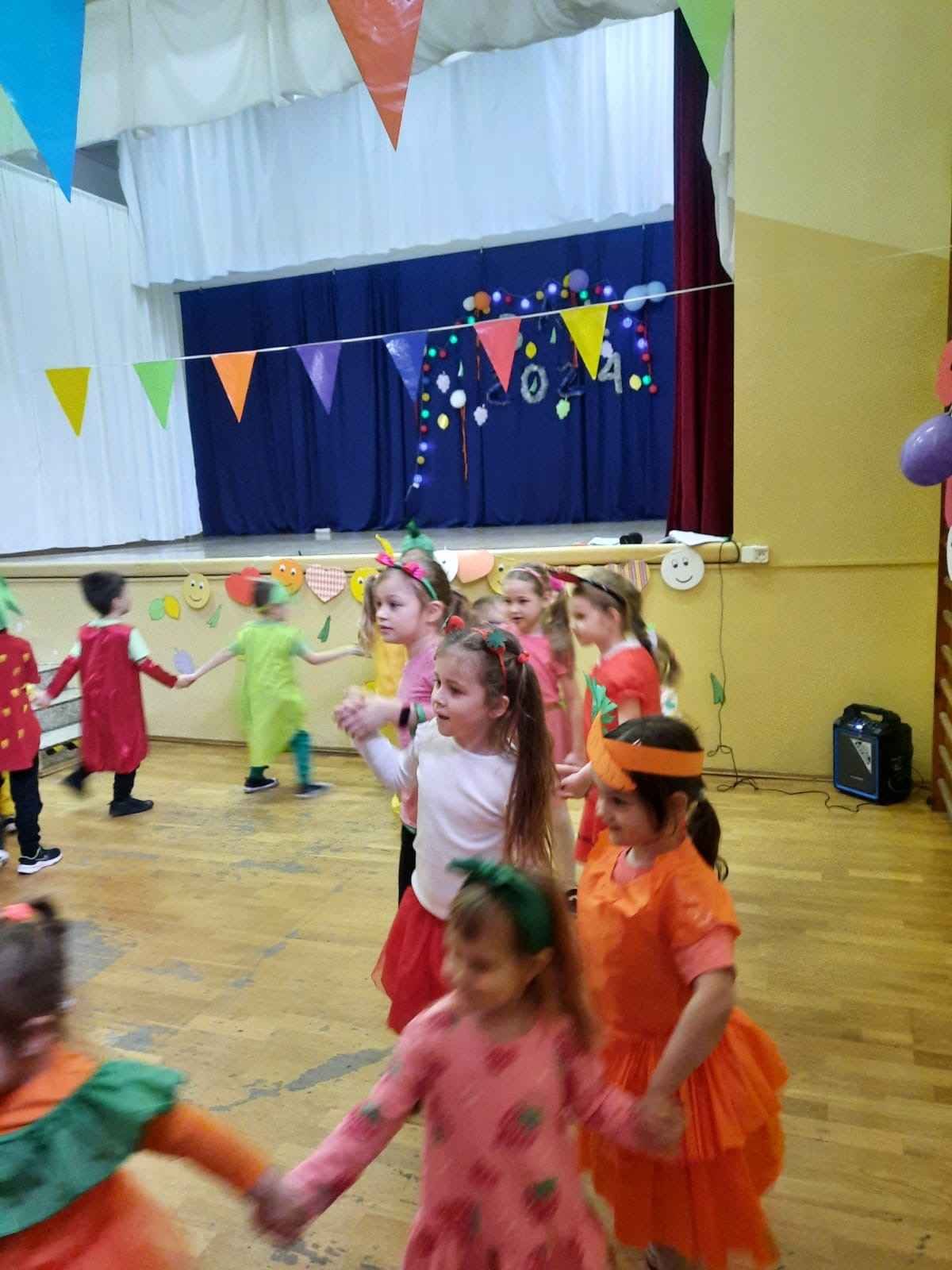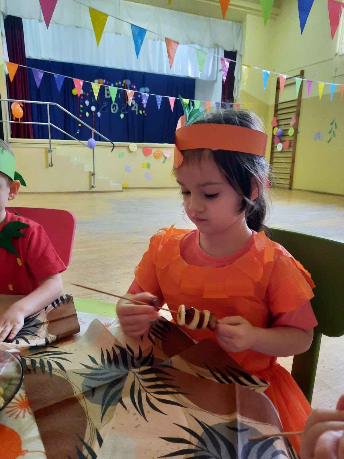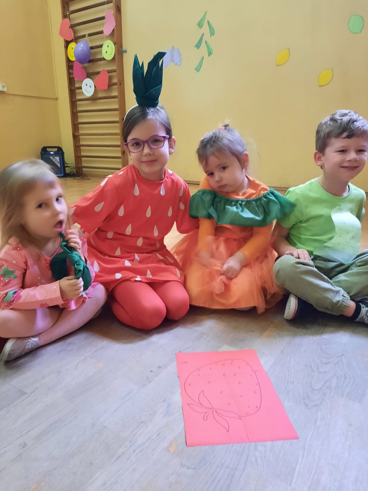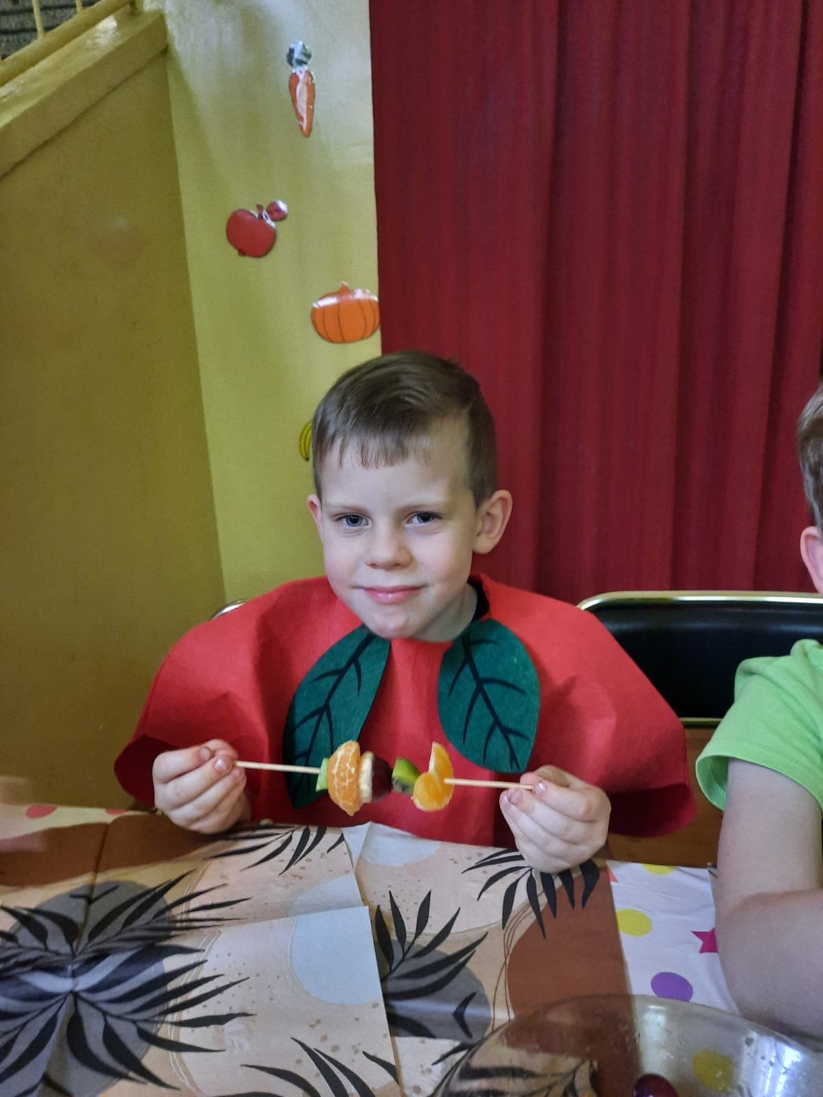 Tego dnia dzieci prezentowały się w owocowo-warzywnych strojach. W czasie balu przedszkolaki wysłuchały bajki „O księżniczce Zuzance i rycerzu Witaminku”. Wzięły udział w zabawach, konkursach sprawnościowych. Dzieci bawiły się i tańczyły przy znanych i lubianych piosenkach o tematyce warzywno-owocowej. Szczególną atrakcją dla dzieci okazały się owocowe szaszłyki, które wykonały samodzielnie. Było kolorowo,wesoło,smacznie i zdrowo.
