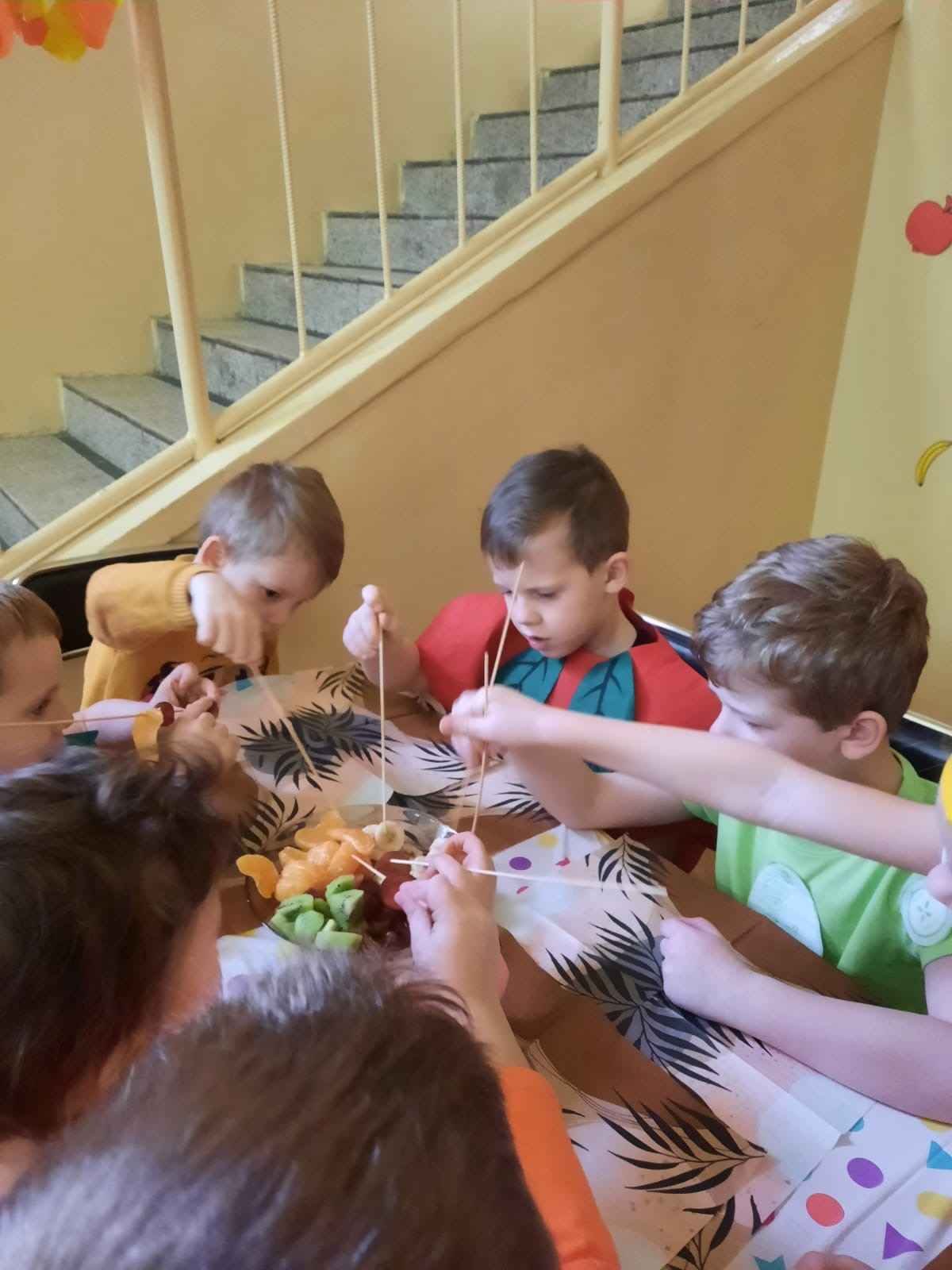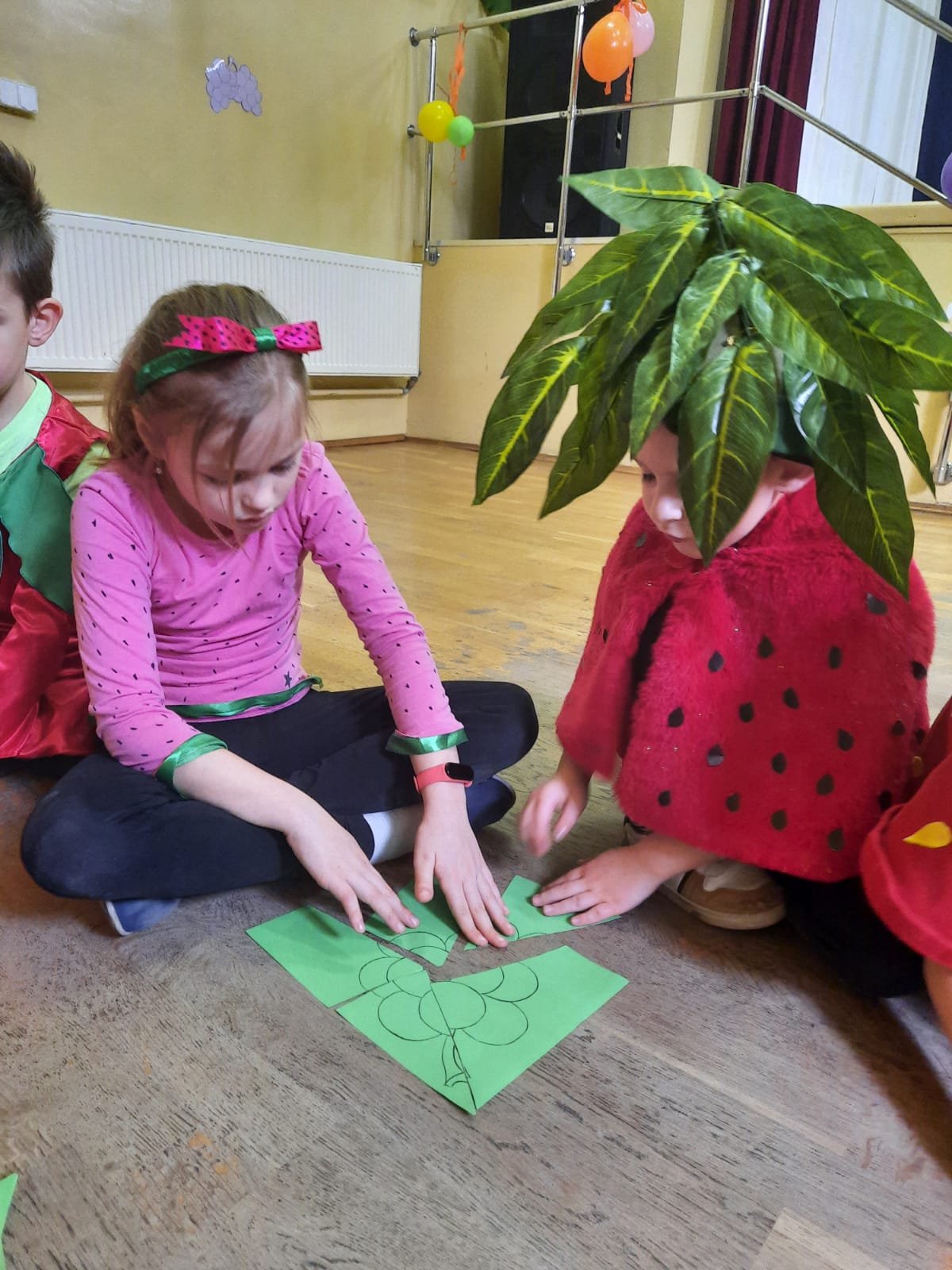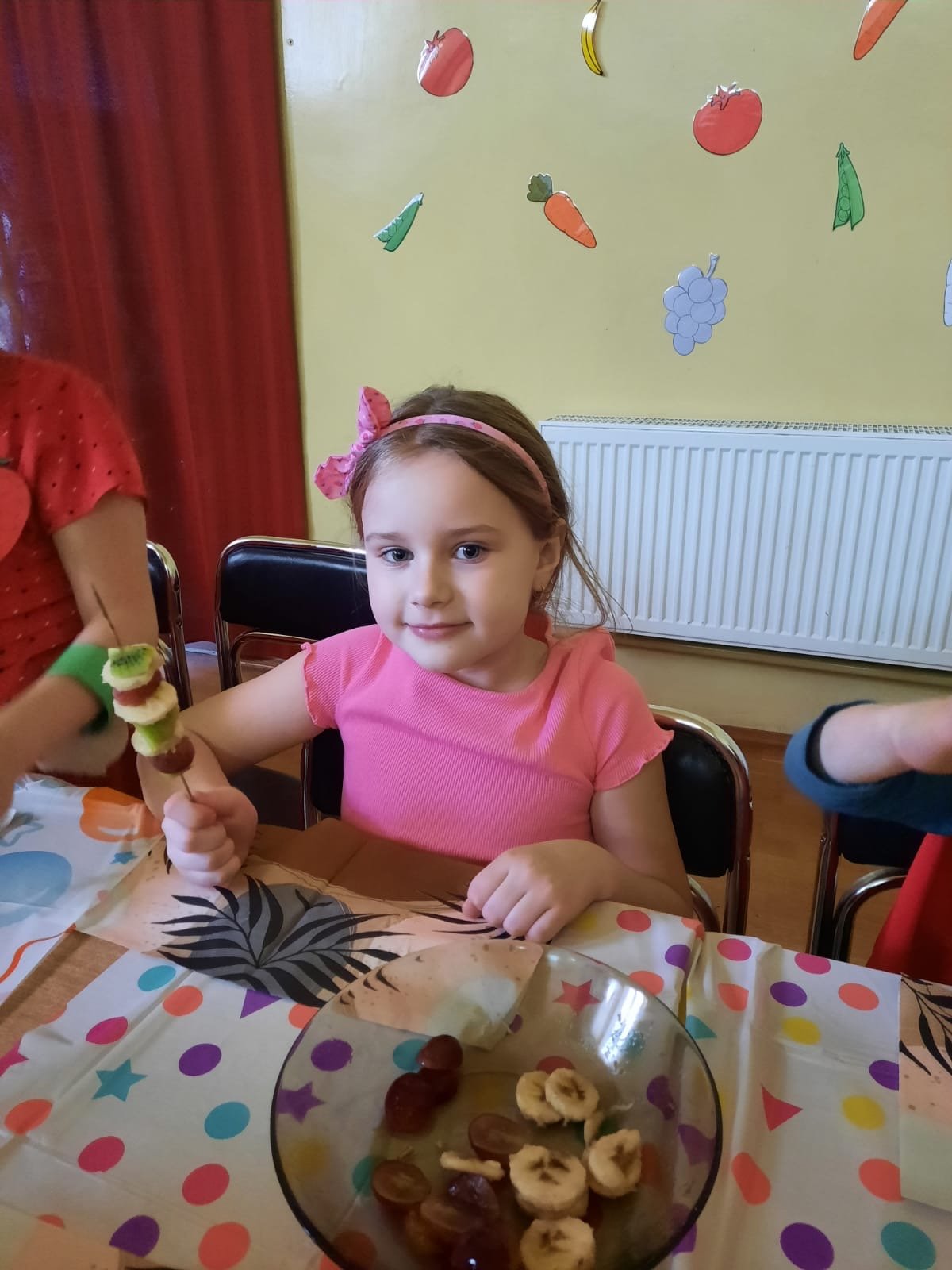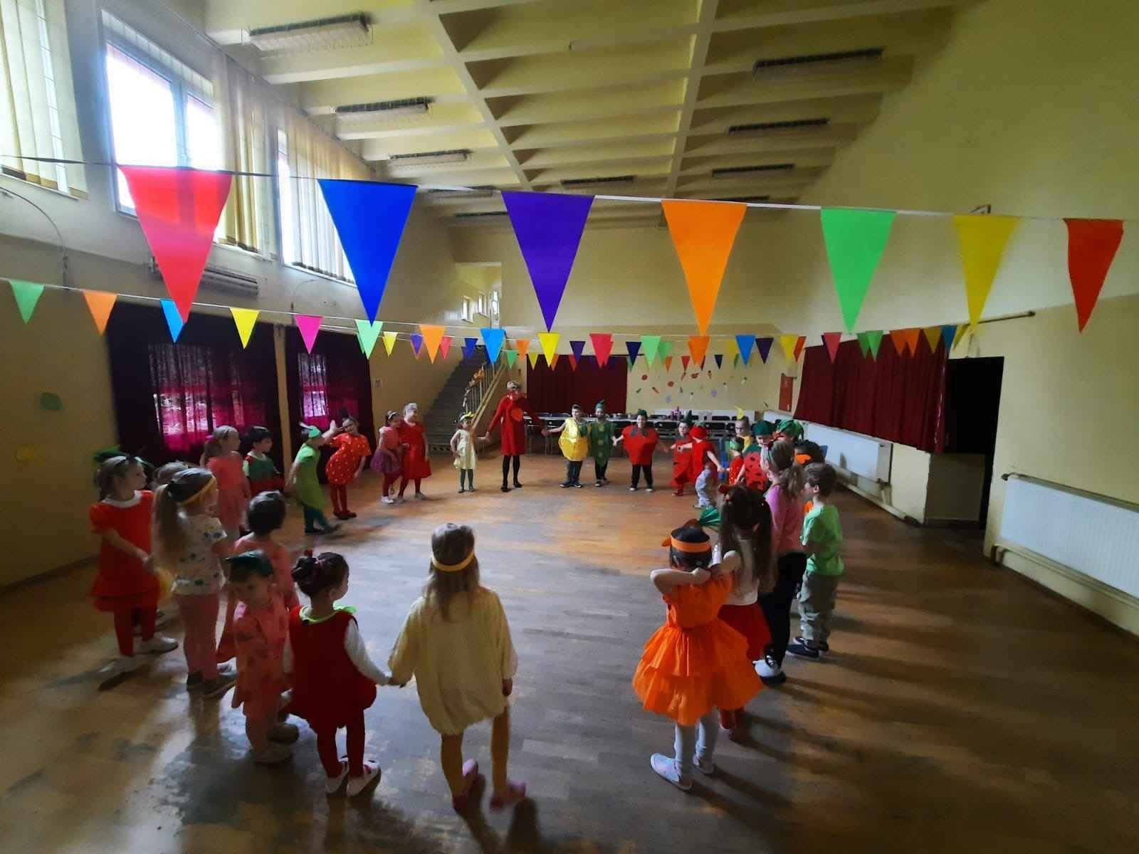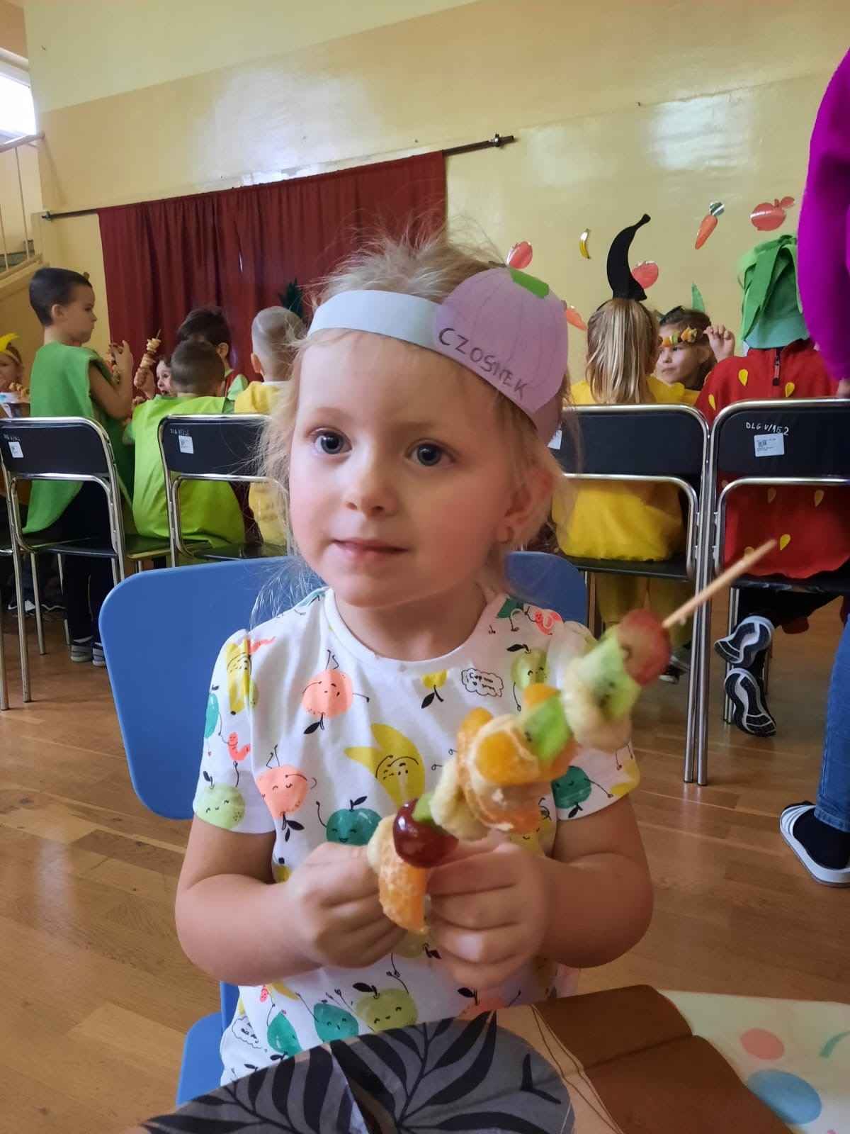Tego dnia dzieci prezentowały się w owocowo-warzywnych strojach. W czasie balu przedszkolaki wysłuchały bajki „O księżniczce Zuzance i rycerzu Witaminku”. Wzięły udział w zabawach, konkursach sprawnościowych. Dzieci bawiły się i tańczyły przy znanych i lubianych piosenkach o tematyce warzywno-owocowej. Szczególną atrakcją dla dzieci okazały się owocowe szaszłyki, które wykonały samodzielnie. Było kolorowo,wesoło,smacznie i zdrowo.