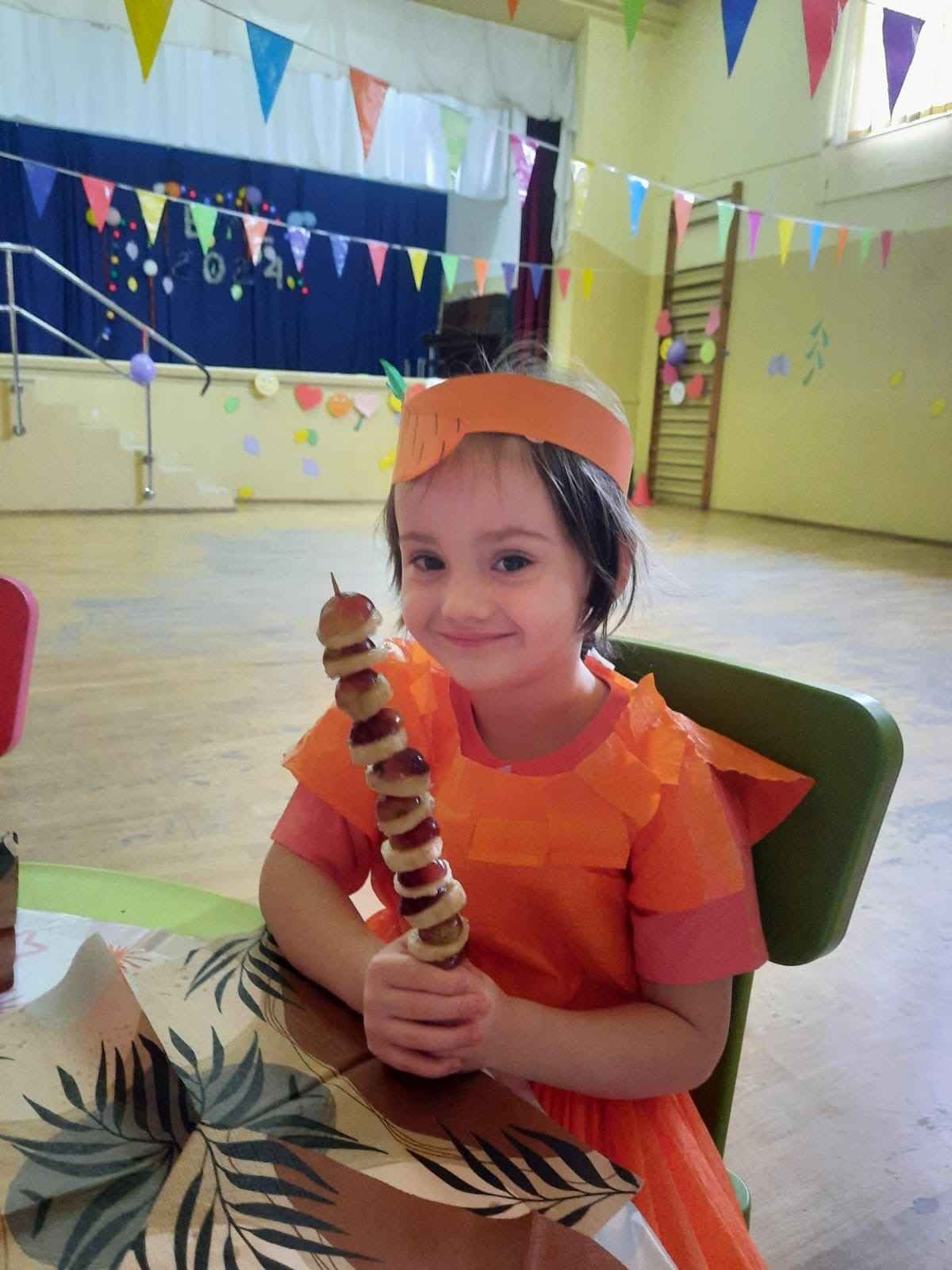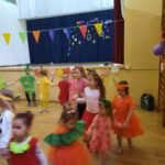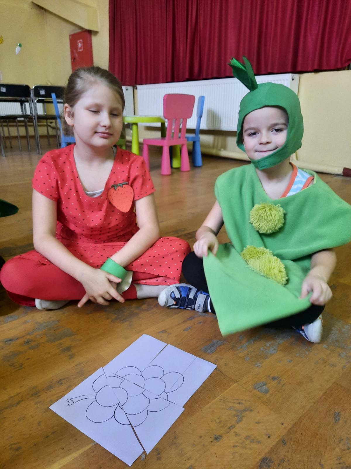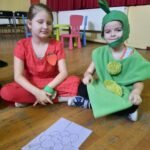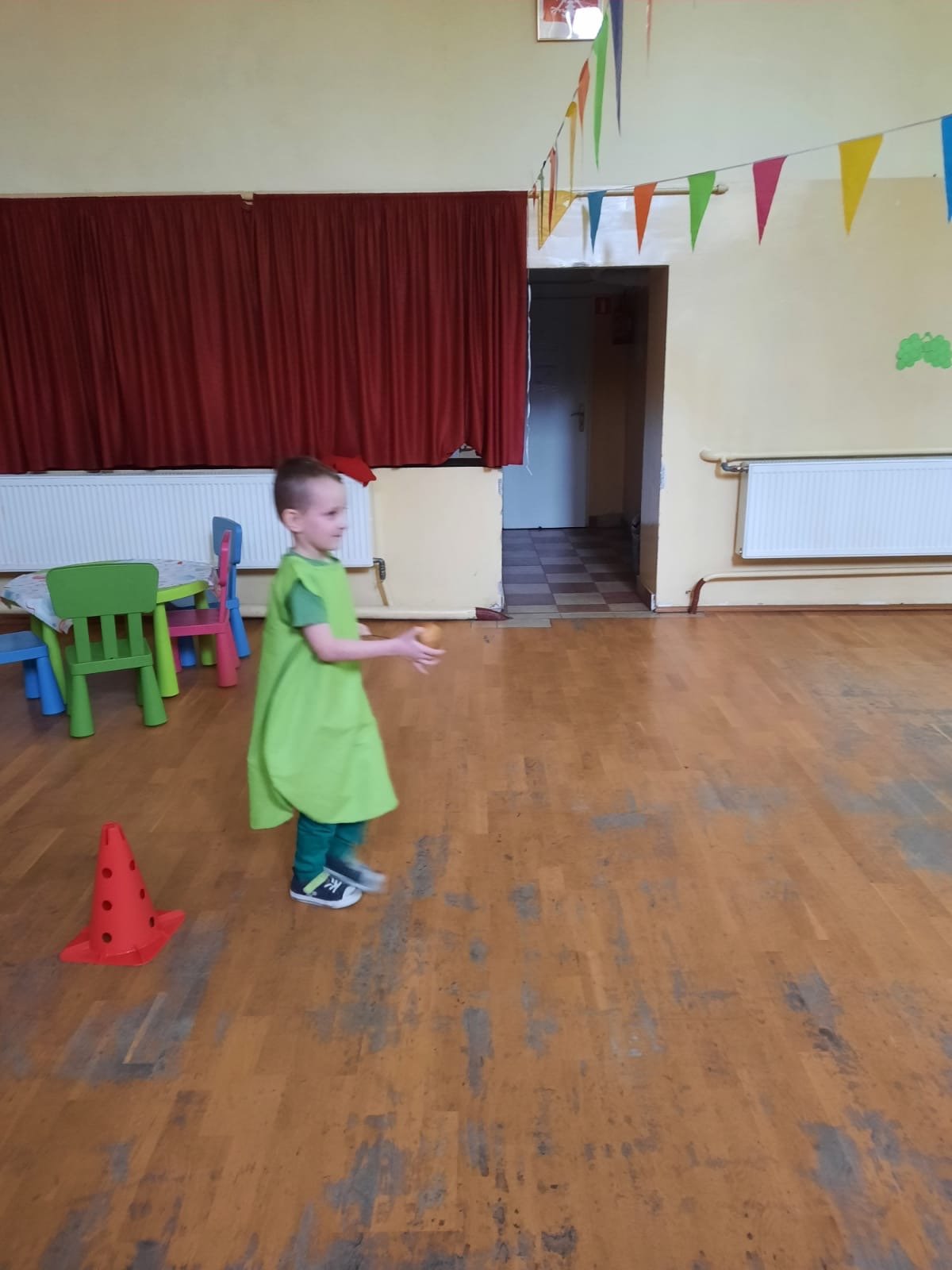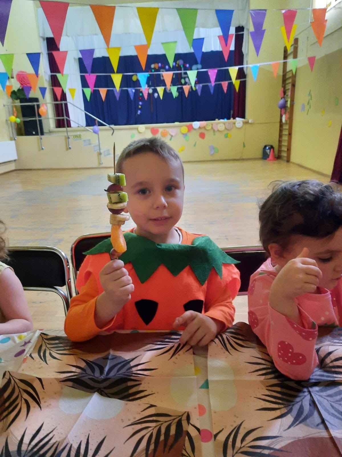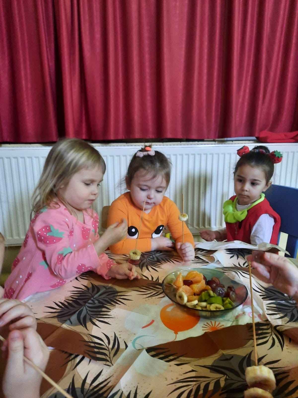 Tego dnia dzieci prezentowały się w owocowo-warzywnych strojach. W czasie balu przedszkolaki wysłuchały bajki „O księżniczce Zuzance i rycerzu Witaminku”. Wzięły udział w zabawach, konkursach sprawnościowych. Dzieci bawiły się i tańczyły przy znanych i lubianych piosenkach o tematyce warzywno-owocowej. Szczególną atrakcją dla dzieci okazały się owocowe szaszłyki, które wykonały samodzielnie. Było kolorowo,wesoło,smacznie i zdrowo.