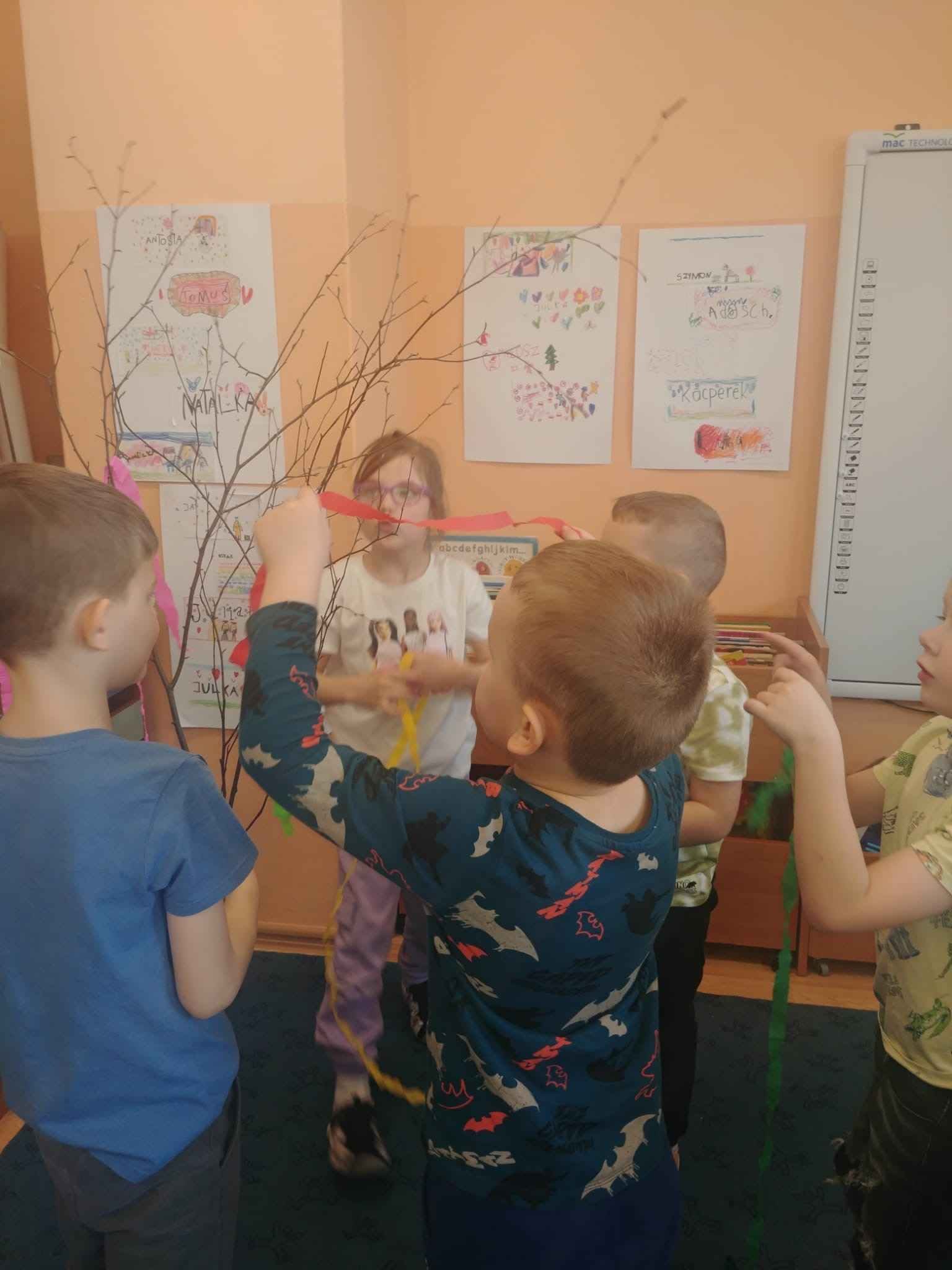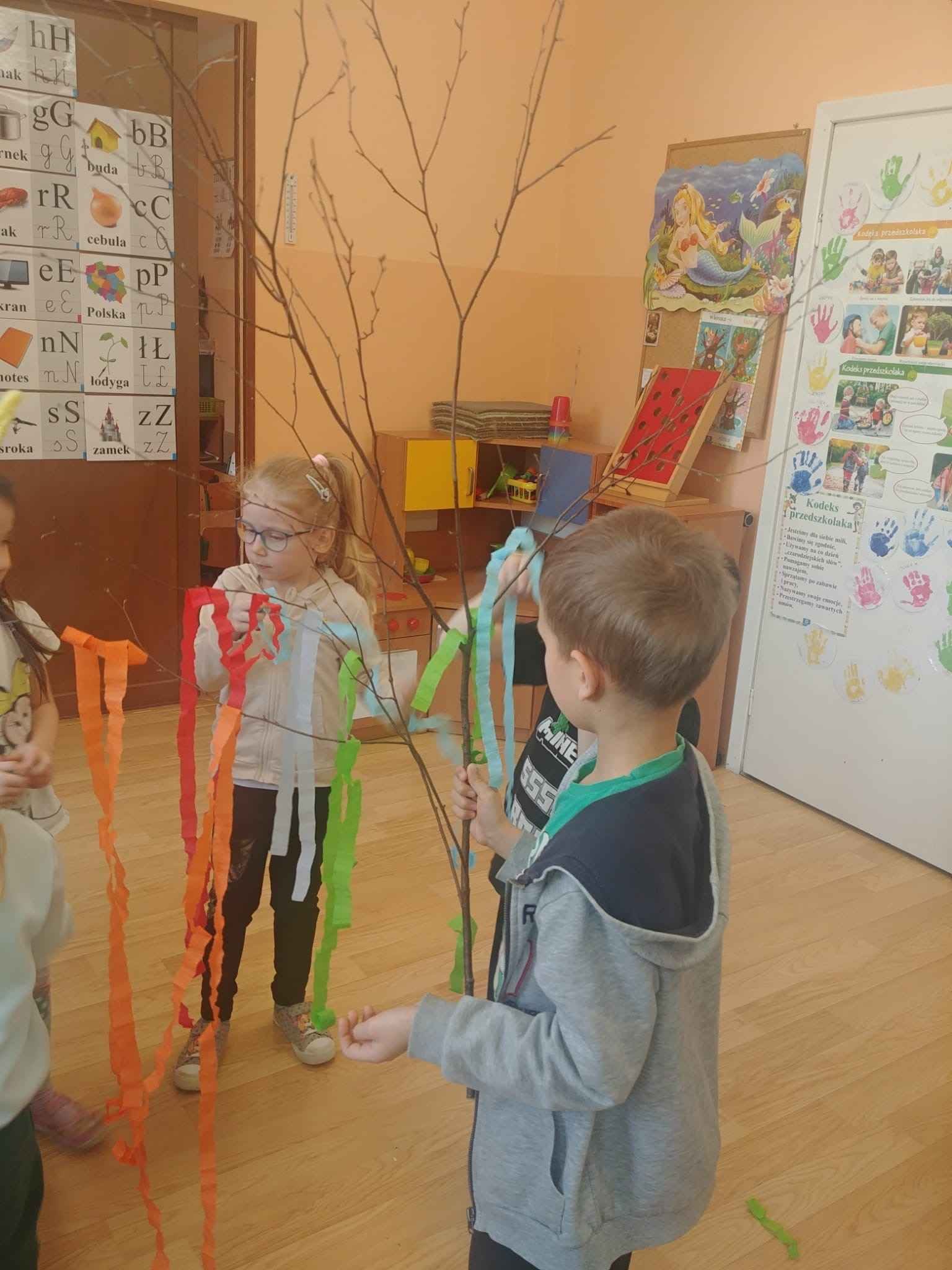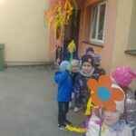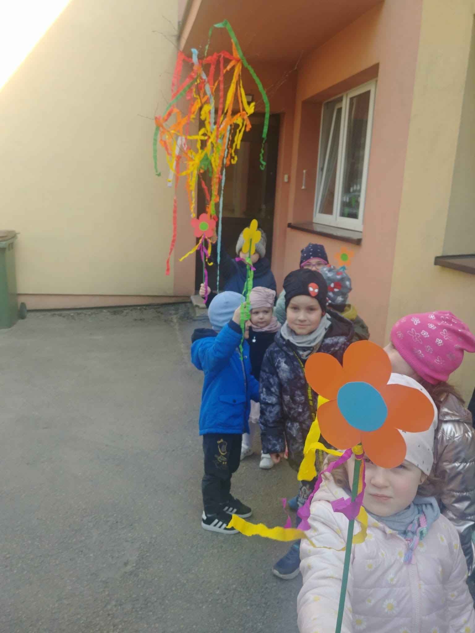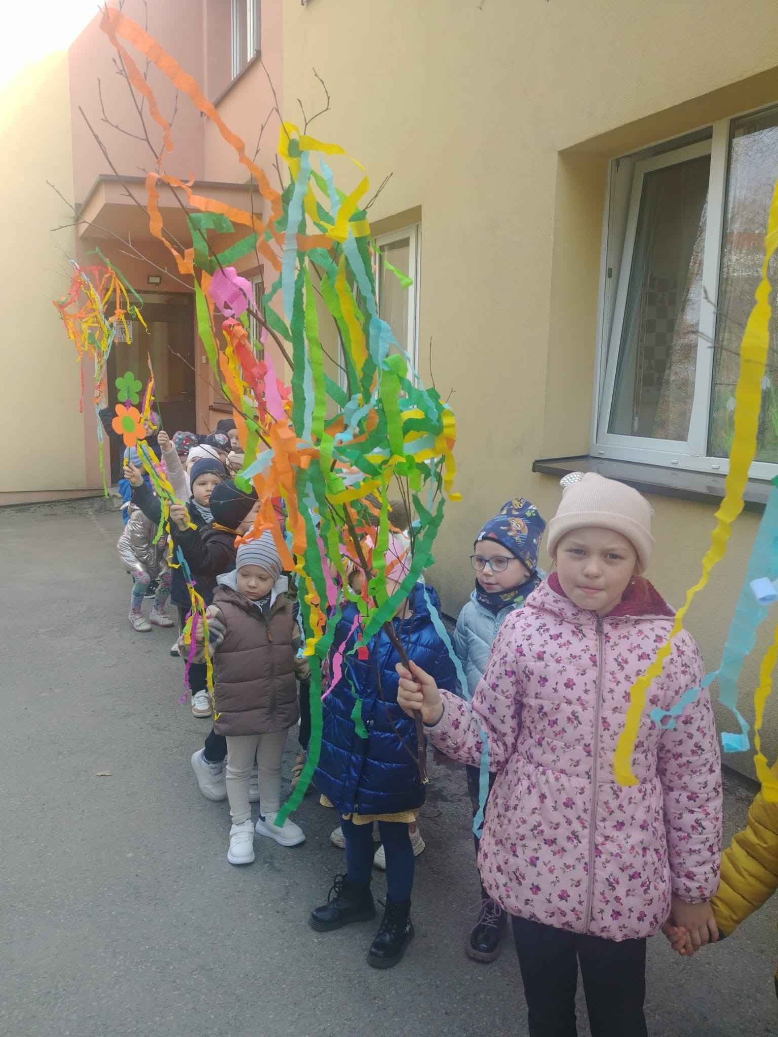 Przedszkolaki z Grojca przywitały Wiosnę wykonując jej portret- ozdabiały sylwetę wiosny elementami z kolorowego papieru. Zrobiły również „Gaik”- symbol wiosny, z którym przemaszerowały w okolicy przedszkola śpiewając wiosenne piosenki.
