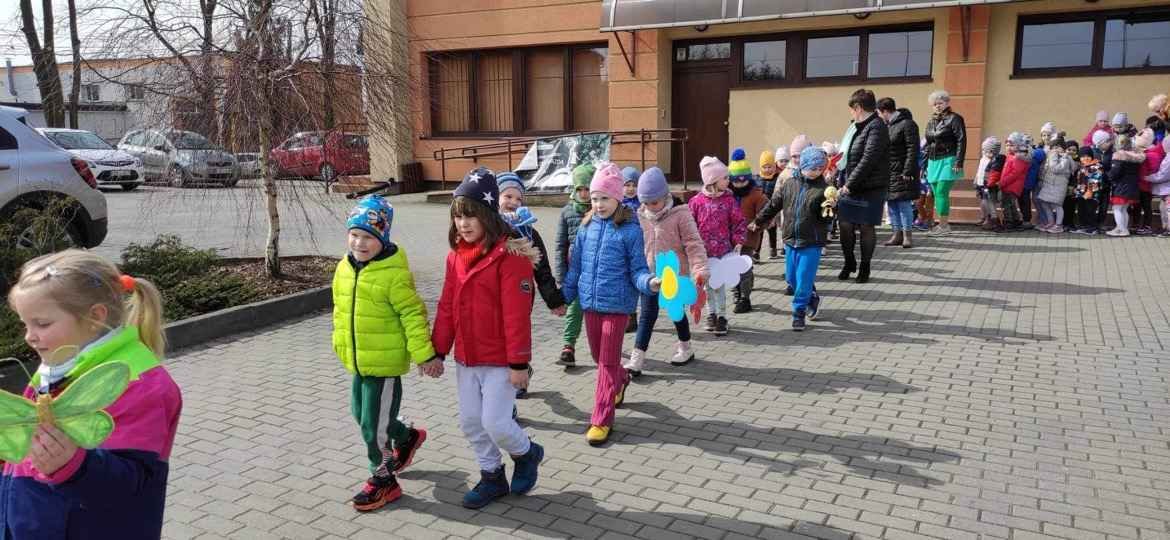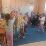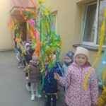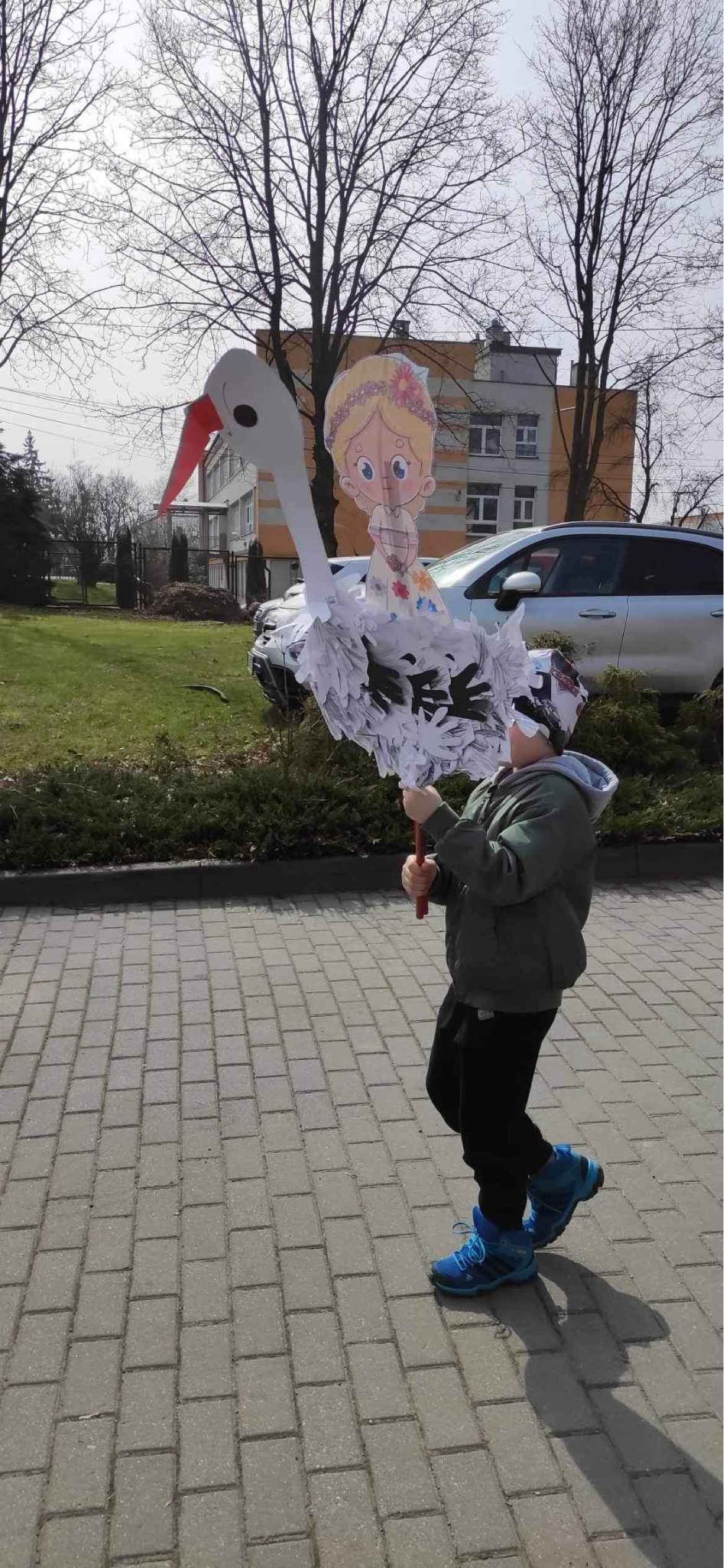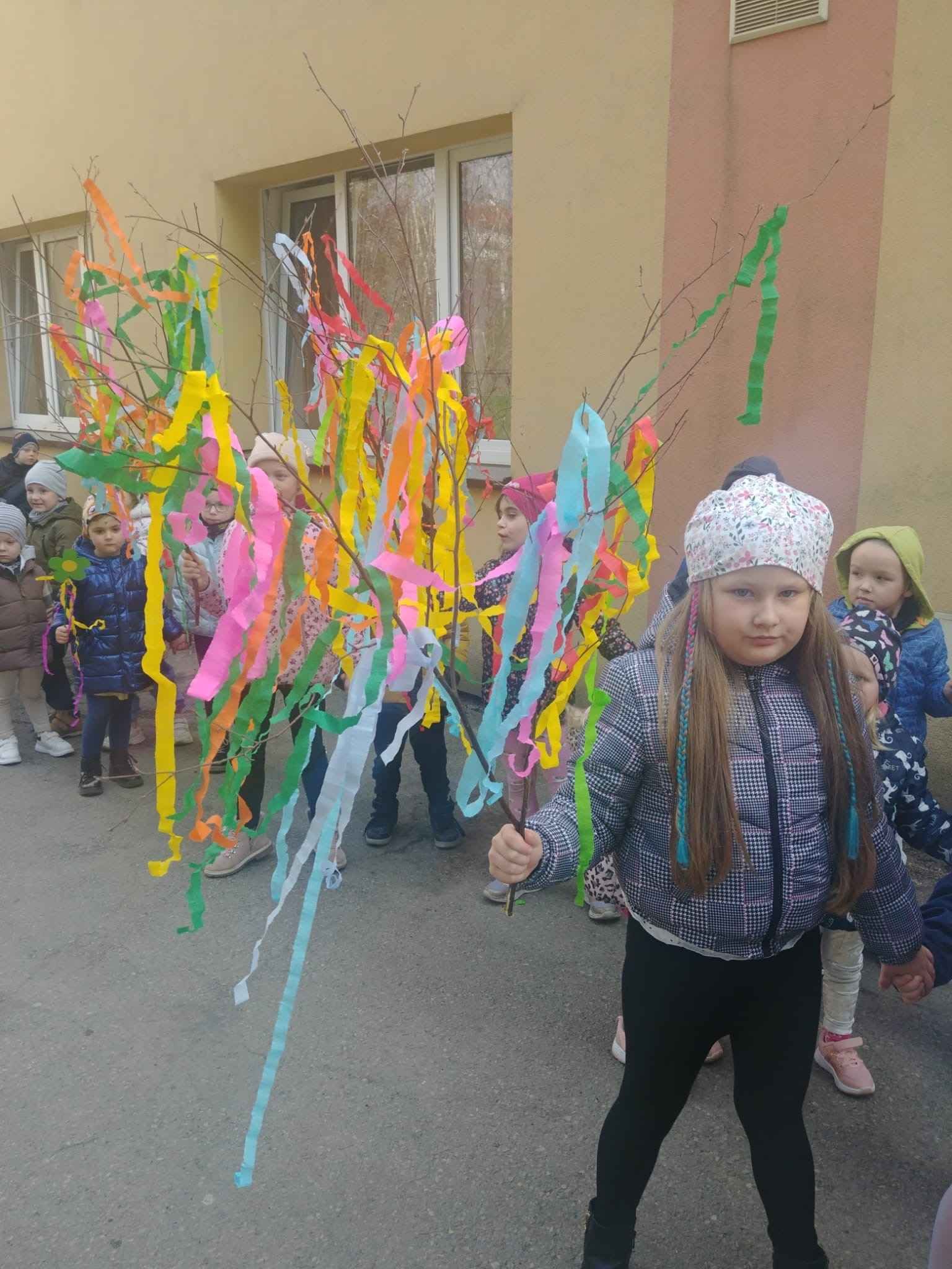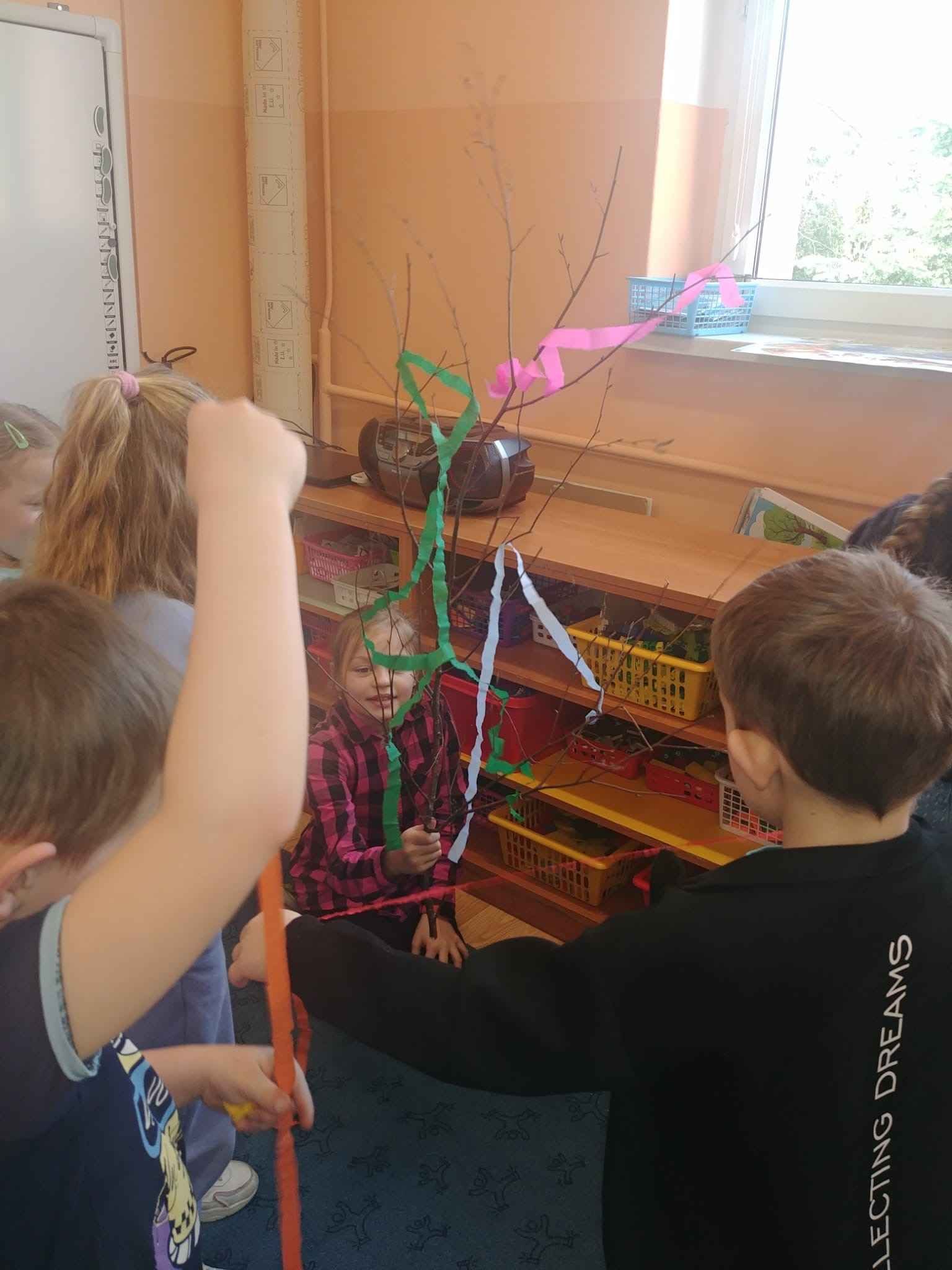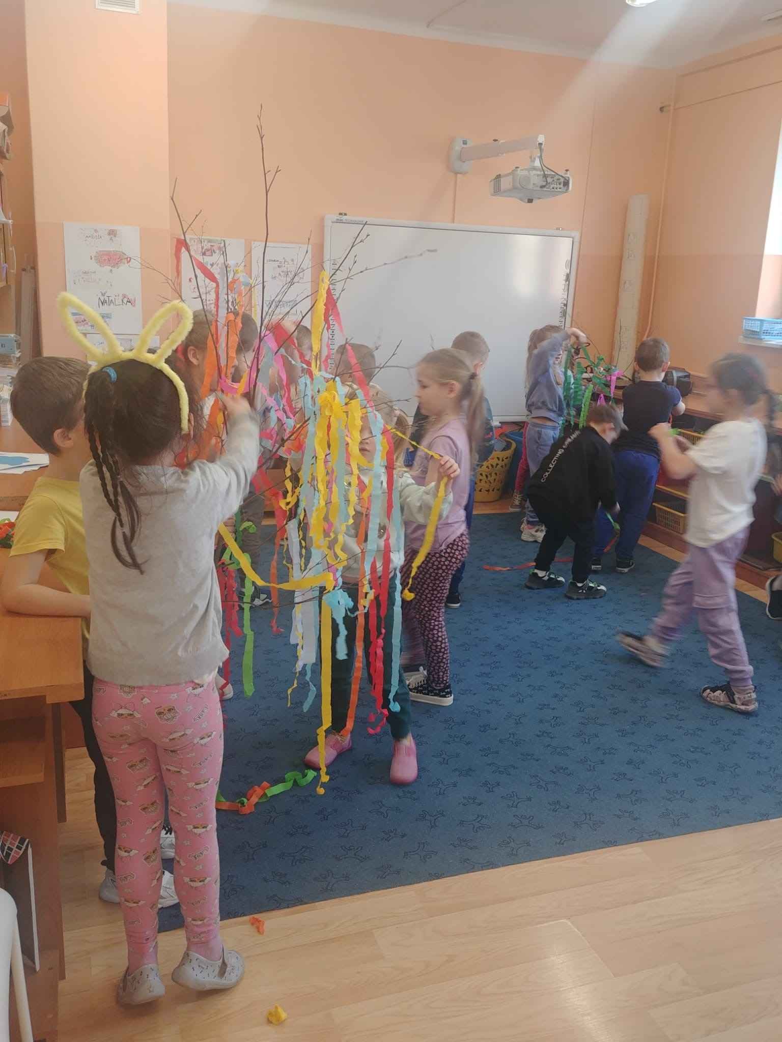 Przedszkolaki z Grojca przywitały Wiosnę wykonując jej portret- ozdabiały sylwetę wiosny elementami z kolorowego papieru. Zrobiły również „Gaik”- symbol wiosny, z którym przemaszerowały w okolicy przedszkola śpiewając wiosenne piosenki.