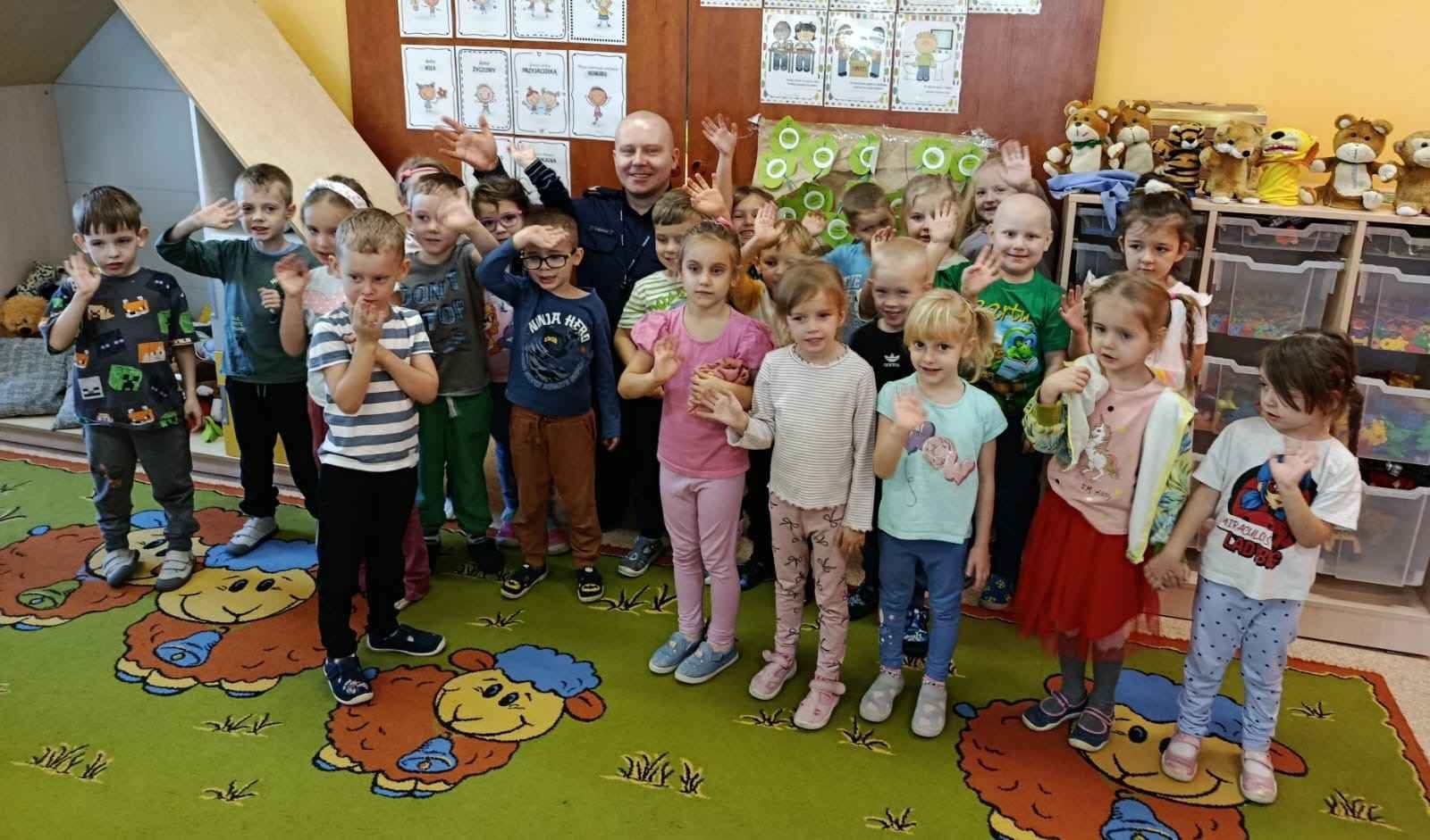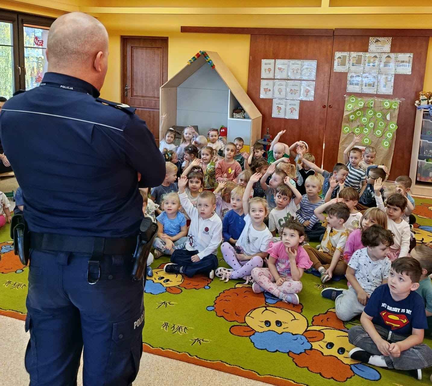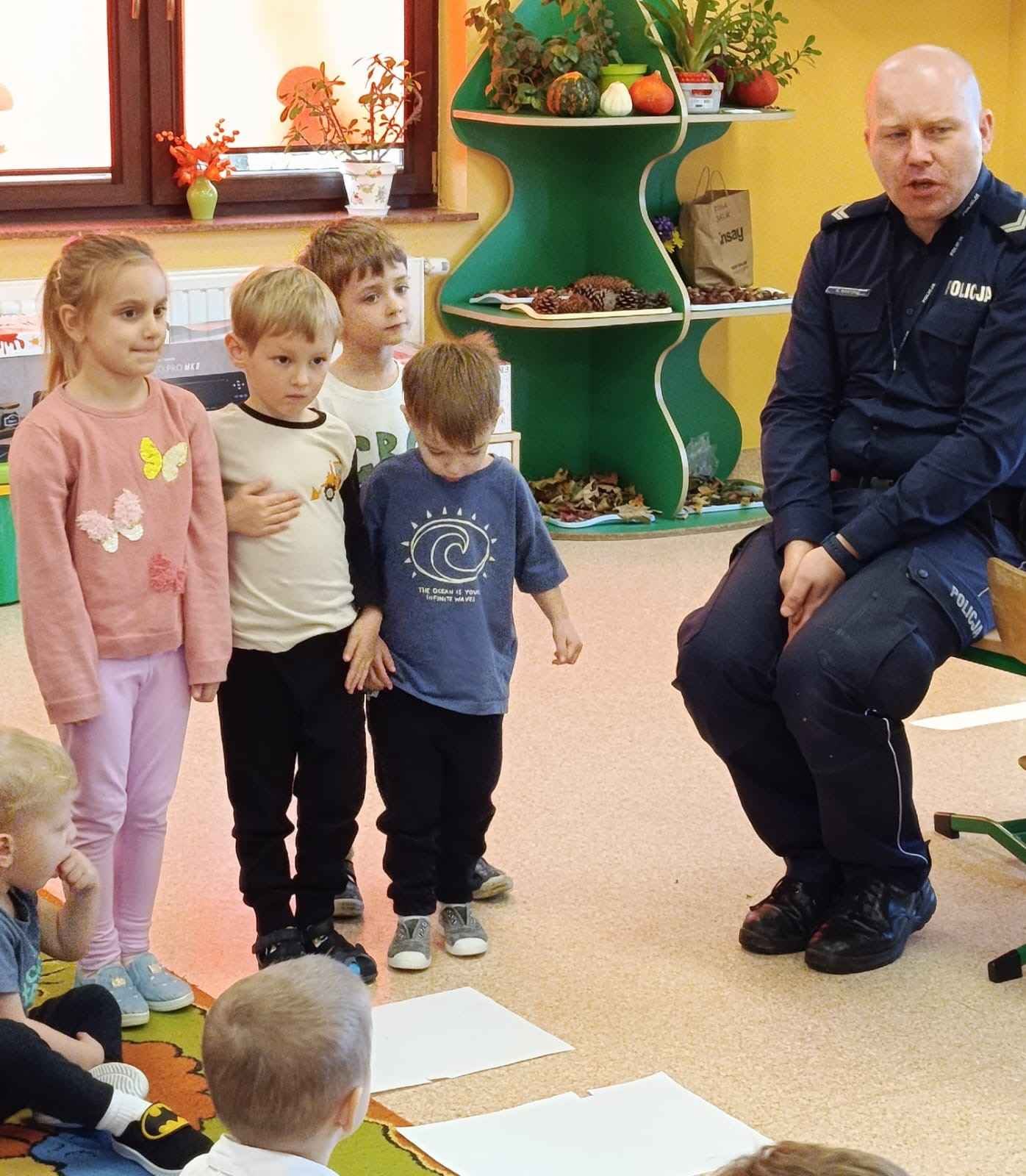 W dniu 4 listopada nasze przedszkole odwiedził pan policjant z Komendy Powiatowej Policji w Chrzanowie. Spotkanie miało na celu przybliżenie dzieciom zawodu policjanta oraz przypomnienie zasad bezpiecznego zachowania w różnych sytuacjach.