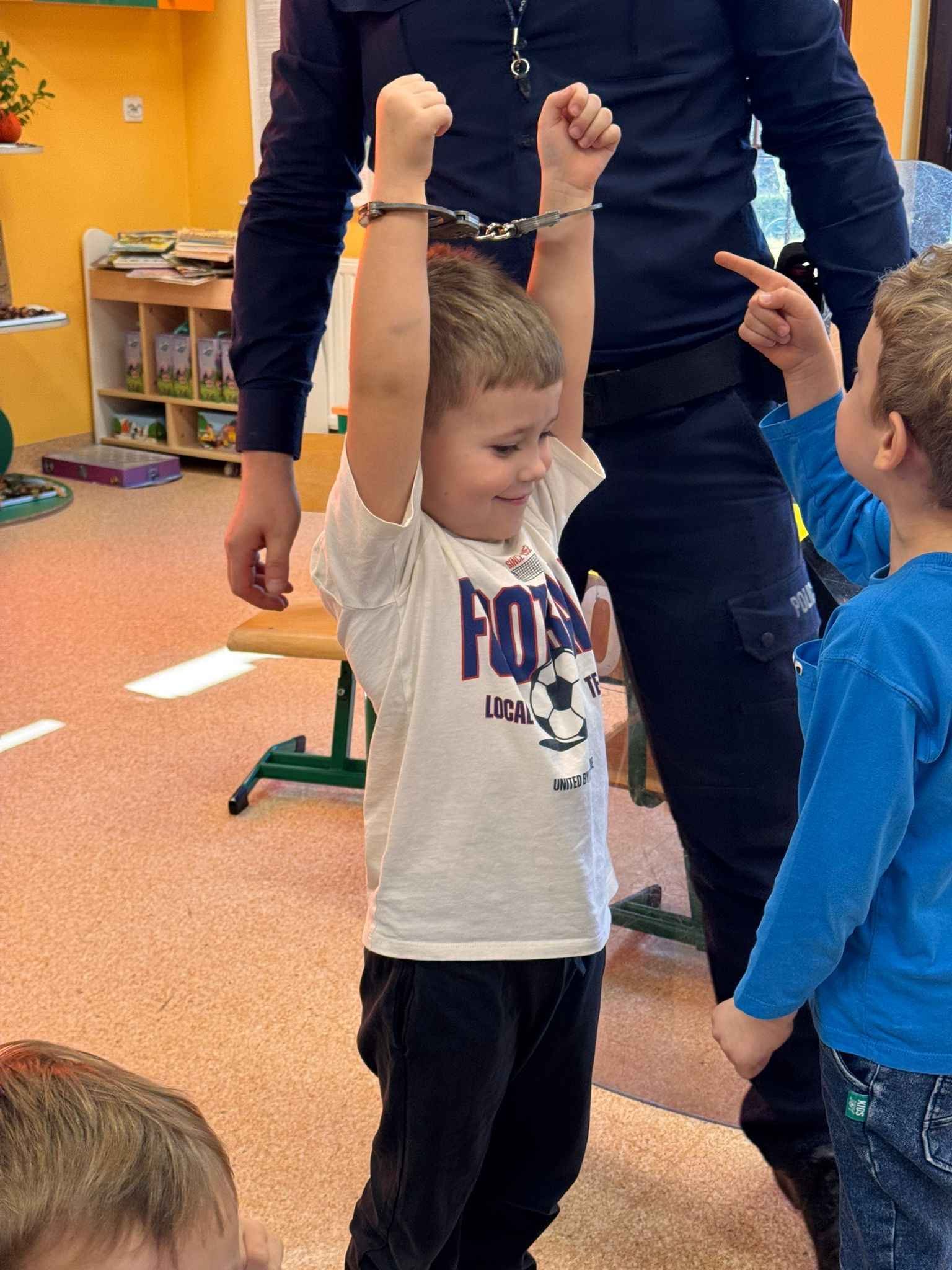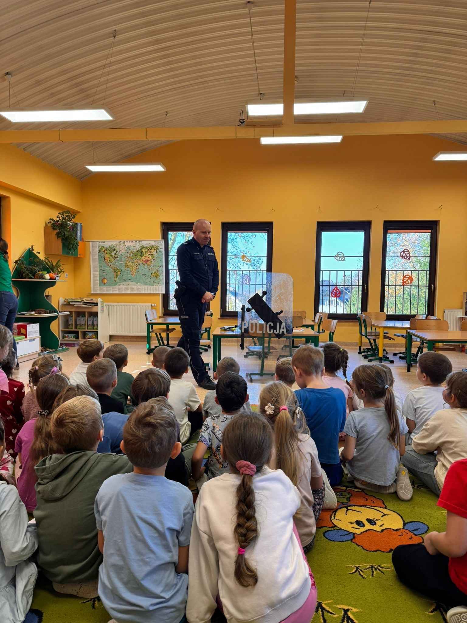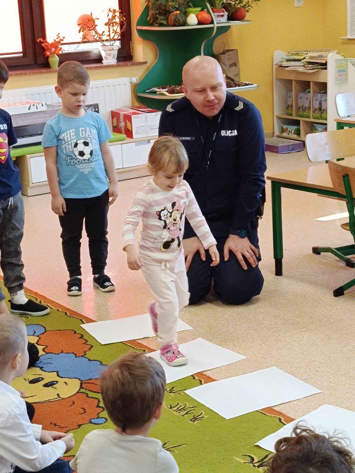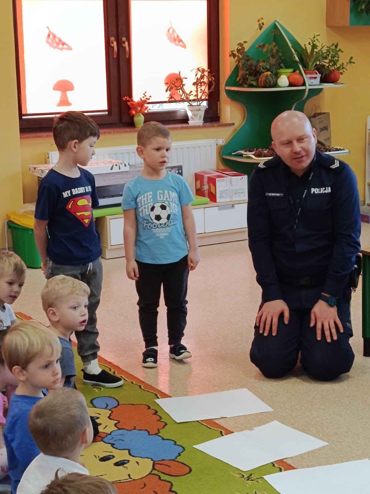 W dniu 4 listopada nasze przedszkole odwiedził pan policjant z Komendy Powiatowej Policji w Chrzanowie. Spotkanie miało na celu przybliżenie dzieciom zawodu policjanta oraz przypomnienie zasad bezpiecznego zachowania w różnych sytuacjach.