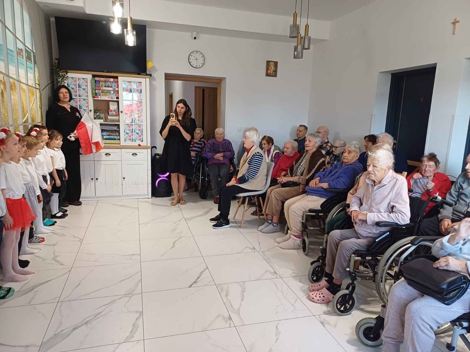 Seniorzy, pod kierunkiem Pani Asi – pracownika Domu Opieki, również aktywnie włączyli się w obchody, wspólnie z dziećmi czytając wiersze o niepodległości i śpiewając patriotyczne piosenki.