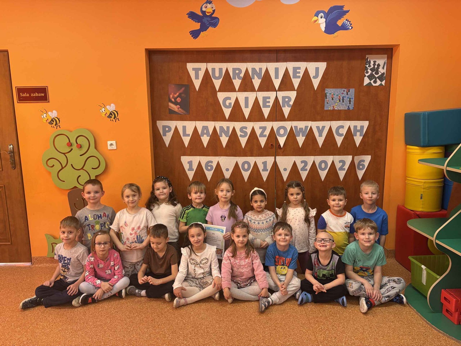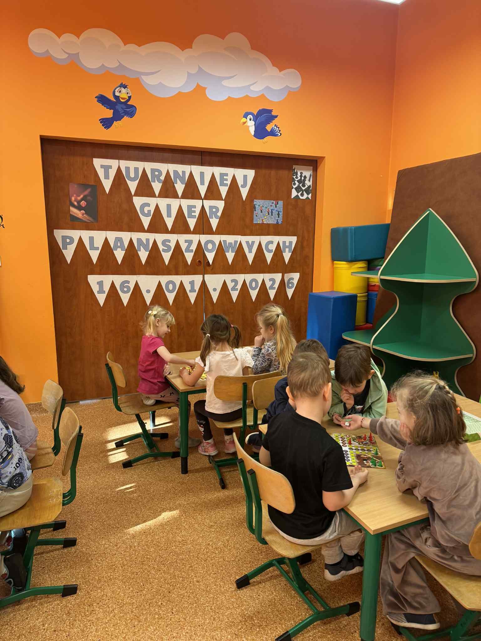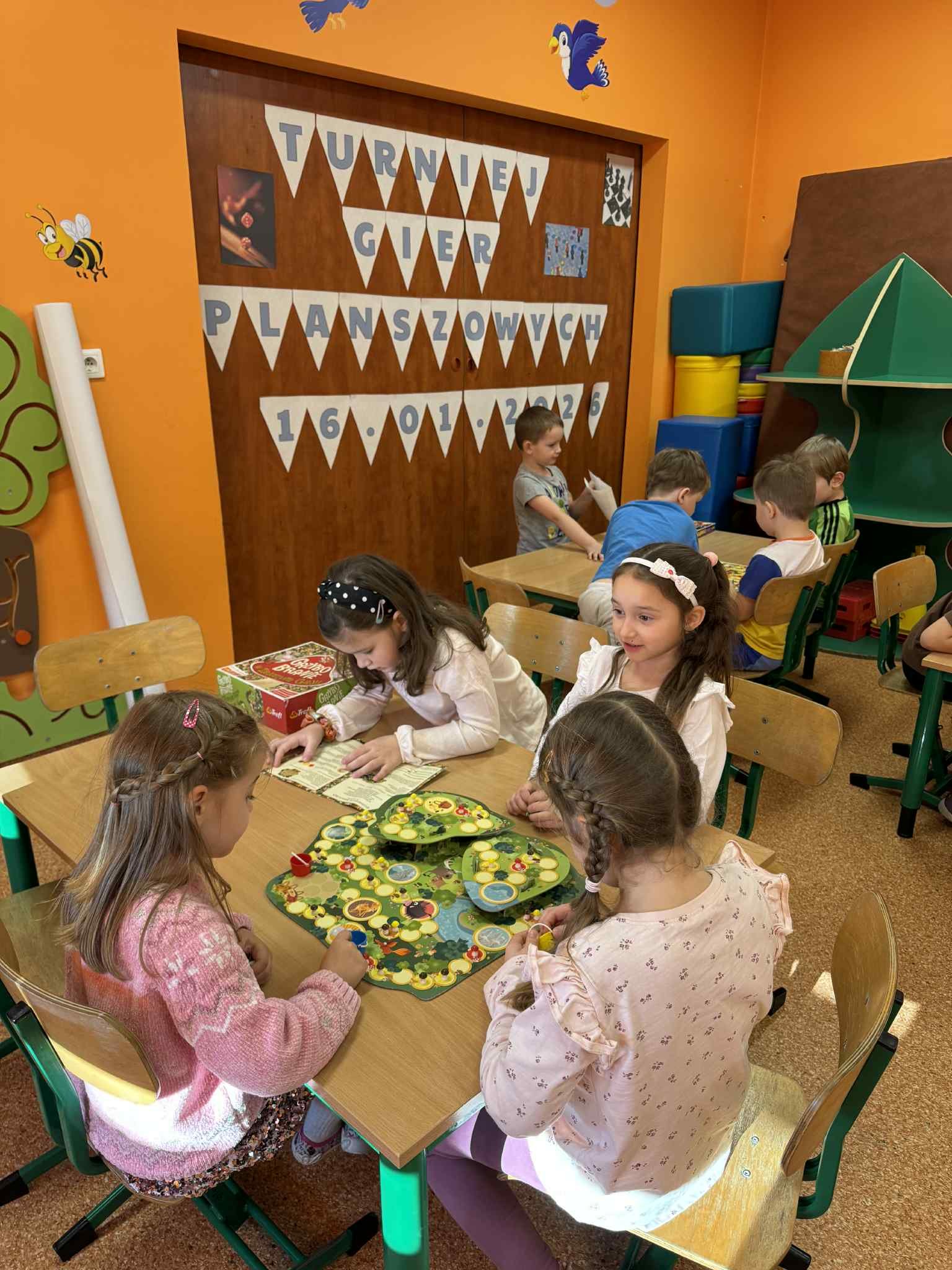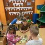 Dzieci miały okazję spróbować swoich sił w różnych grach dostosowanych do ich wieku i umiejętności. Dużym zainteresowaniem cieszył się klasyczny Chińczyk, który uczy cierpliwości, liczenia i radzenia sobie z emocjami. Wiele radości przyniosło także Grzybobranie, podczas którego przedszkolaki ćwiczyły spostrzegawczość oraz umiejętność przeliczania. Nie zabrakło dynamicznej gry Dobble, rozwijającej refleks i koncentrację, a także lubianej przez dzieci gry Memory, wspierającej pamięć i skupienie uwagi.