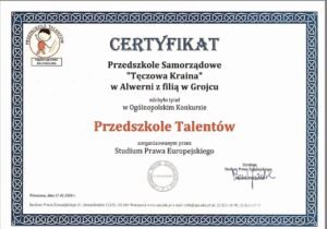 Wszystkie dzieci aktywnie uczestniczyły w zadaniach konkursowych: „Patriotyczny Konkurs Talentów”, ” Turniej Gier Planszowych”, „Bal u Brzechwy i Tuwima- konkurs recytatorski”, „Poznajemy swoje otoczenie” – spacer po Alwerni, ” Kto pierwszy na mecie – zajęcia ruchowe”, ” Poznaję kształty i figury geometryczne”, ” Mój mały sklep”, ” Pory roku i dni, daty w kalendarzu”, ” Kontakty z nieznajomymi – zabawa dramowa”. Dzieci uczyły się kreatywności, poszukiwały różnorodnych rozwiązań, rozwijały swoje talenty i zainteresowania. Realizując wszystkie przedsięwzięcia w ramach konkursu nasza placówka uzyskała Certyfikat „Przedszkole Talentów”. Jesteśmy bardzo dumni z naszych przedszkolaków.