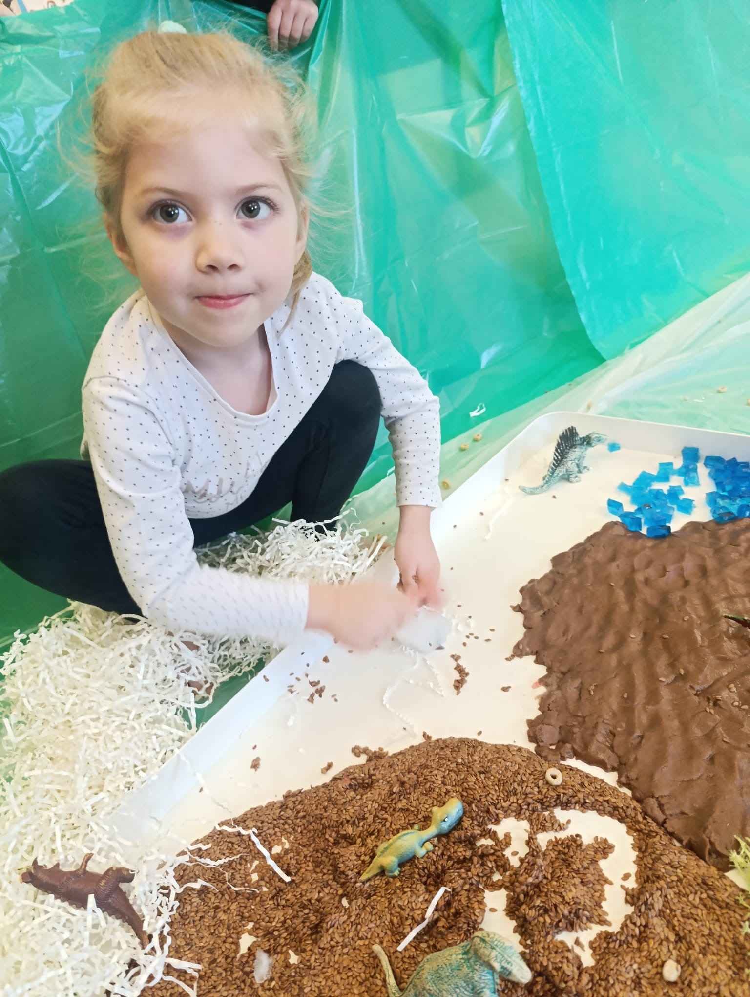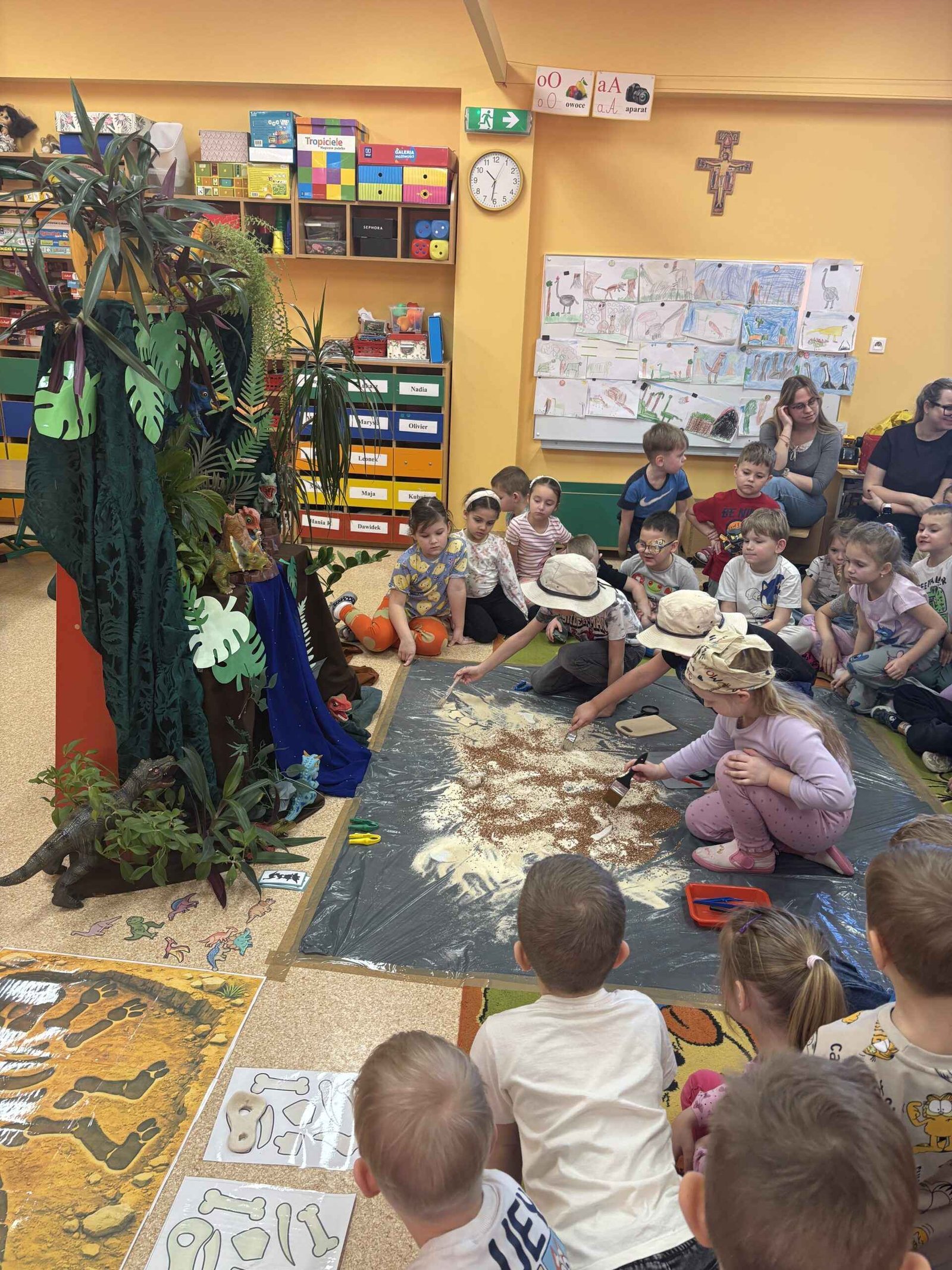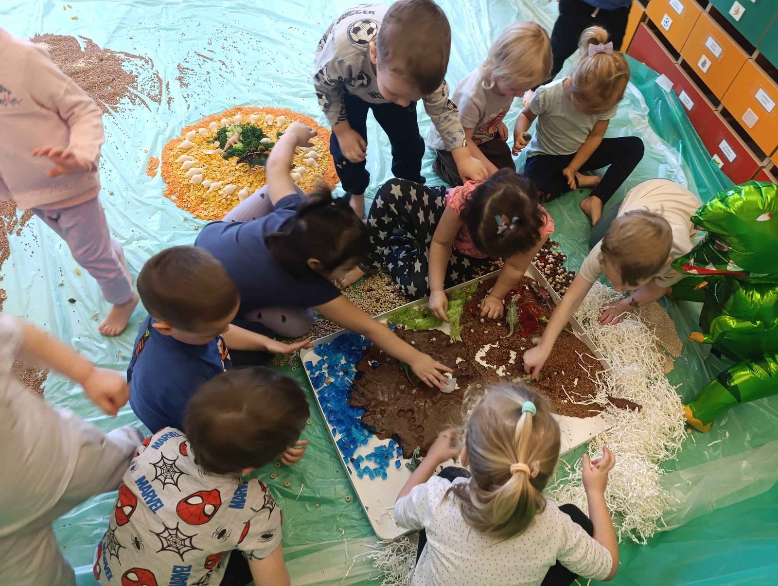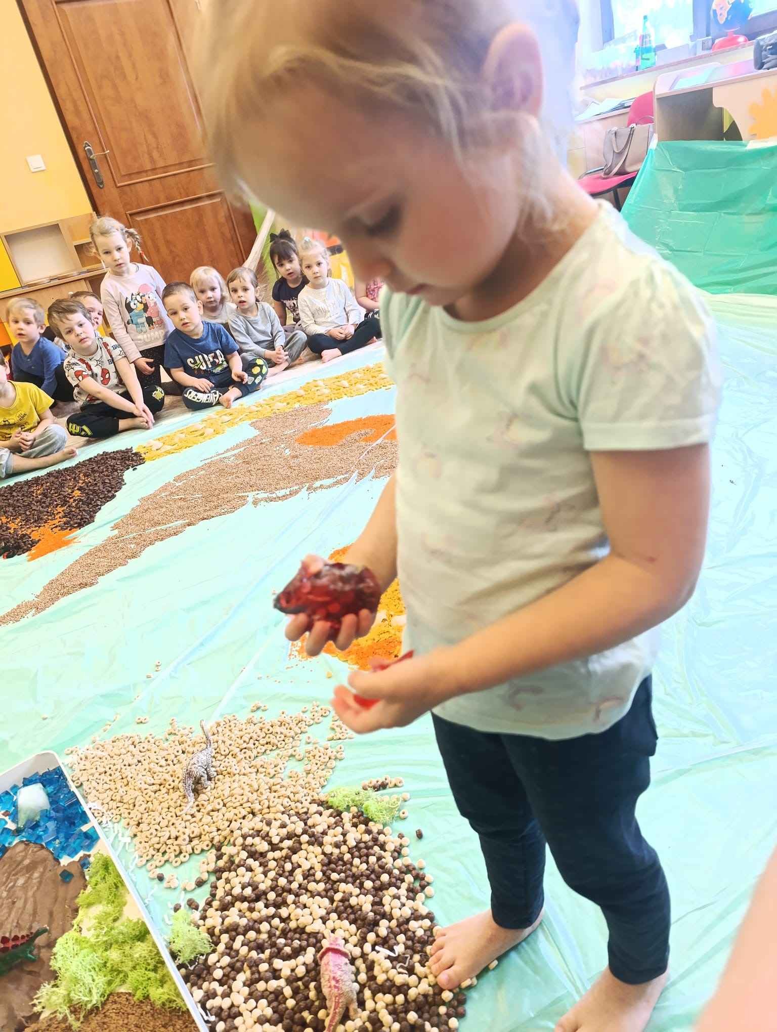 Przedszkolaki uczestniczyły w zajęciach sensorycznych, podczas których mogły dotykać i eksplorować różnorodne materiały nawiązujące do epoki dinozaurów. W masach plastycznych odnajdywały dinozaury, odciskały ślady łap oraz wykonywały własne prehistoryczne artefakty.