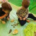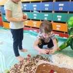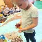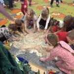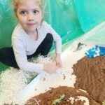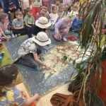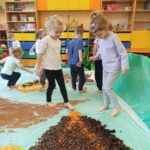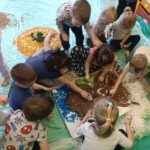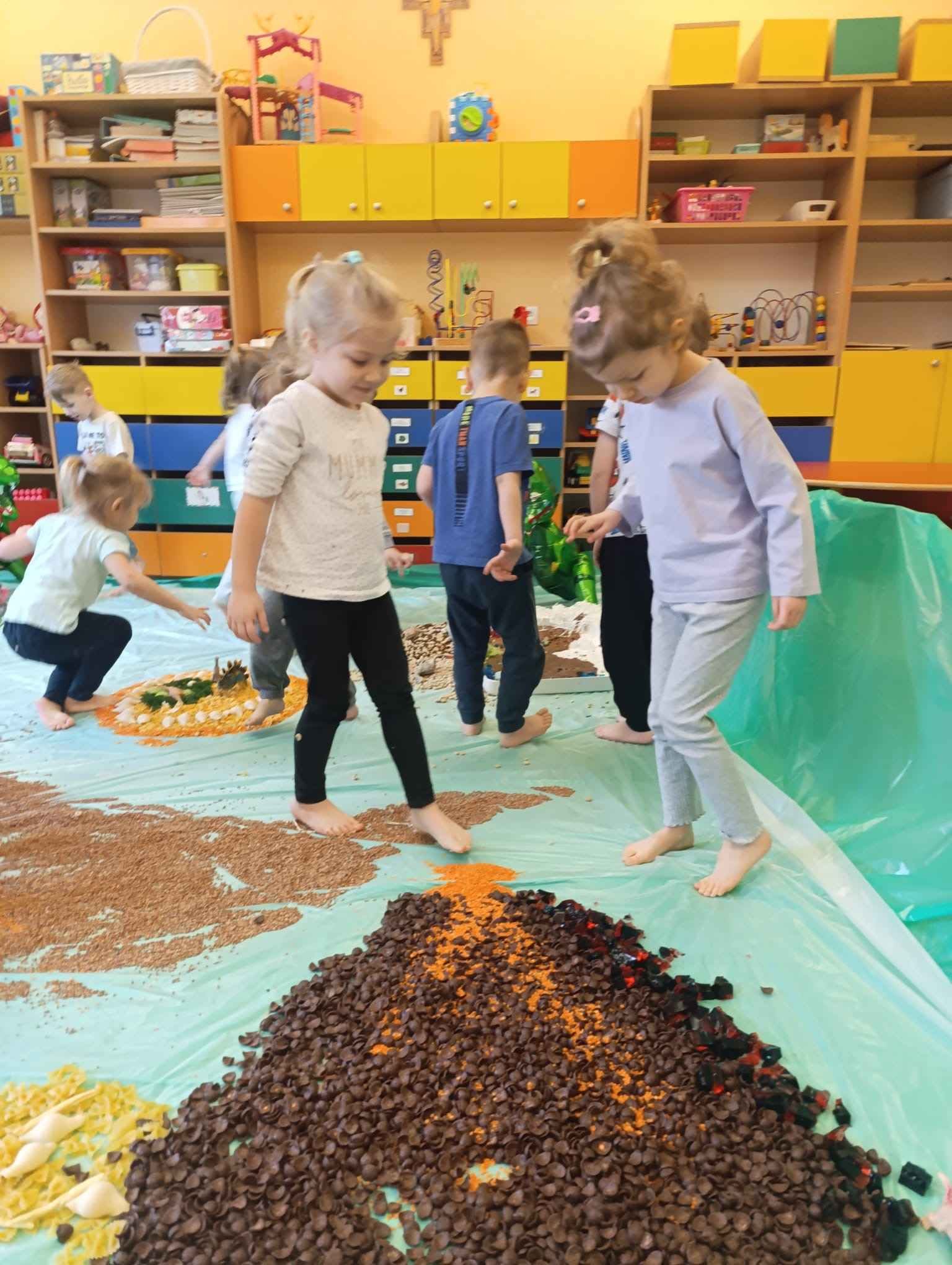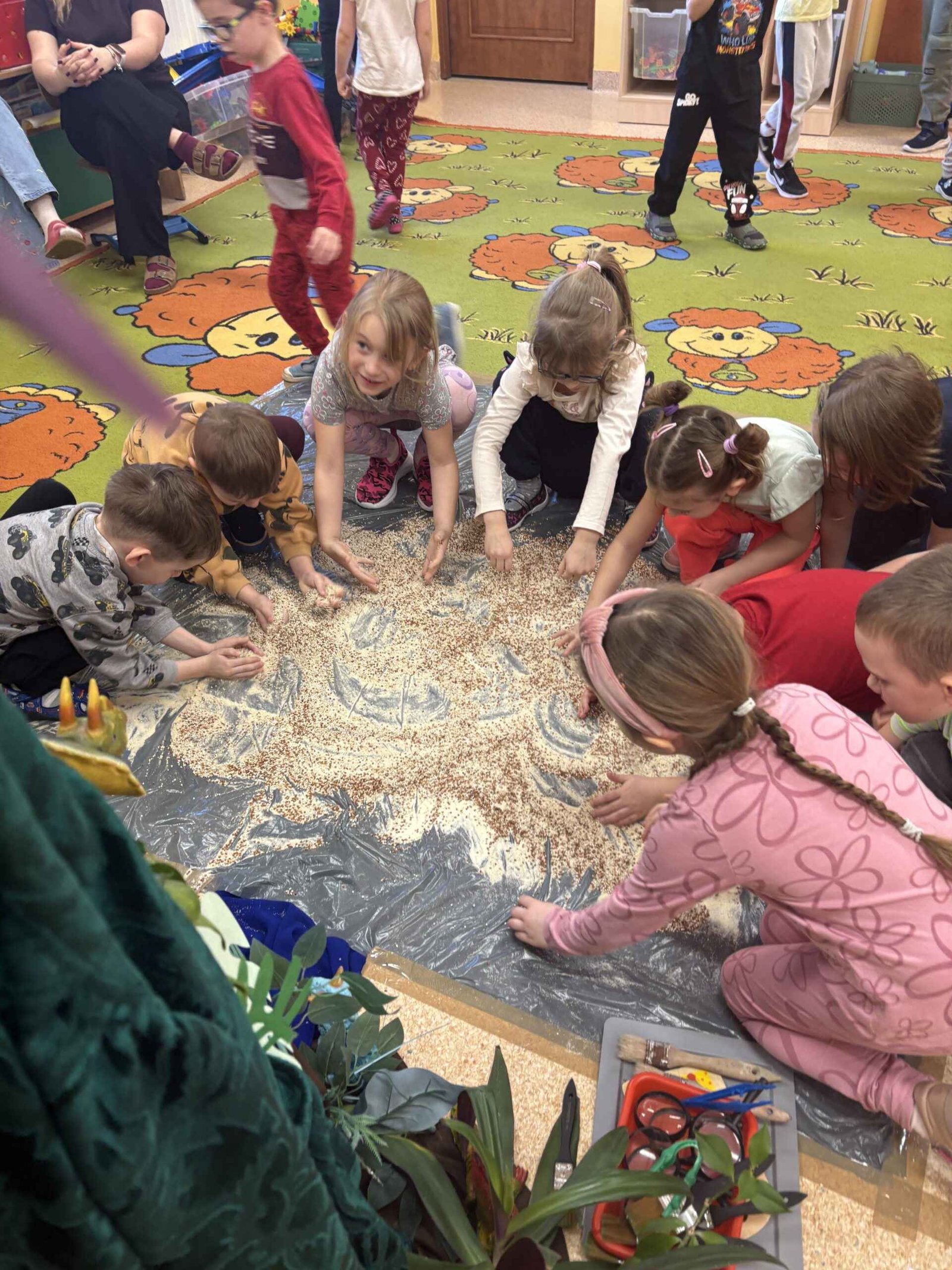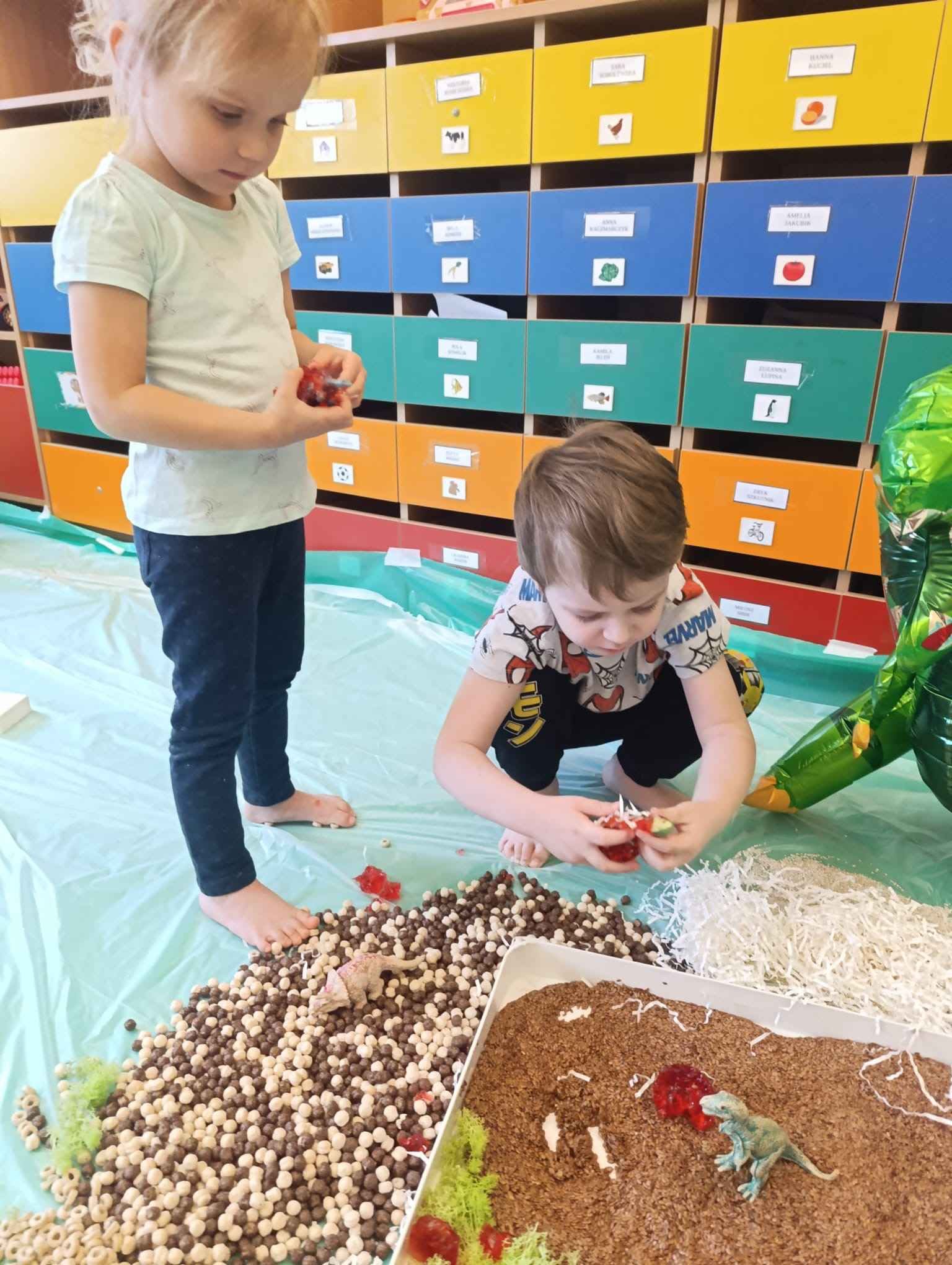 Przedszkolaki uczestniczyły w zajęciach sensorycznych, podczas których mogły dotykać i eksplorować różnorodne materiały nawiązujące do epoki dinozaurów. W masach plastycznych odnajdywały dinozaury, odciskały ślady łap oraz wykonywały własne prehistoryczne artefakty.