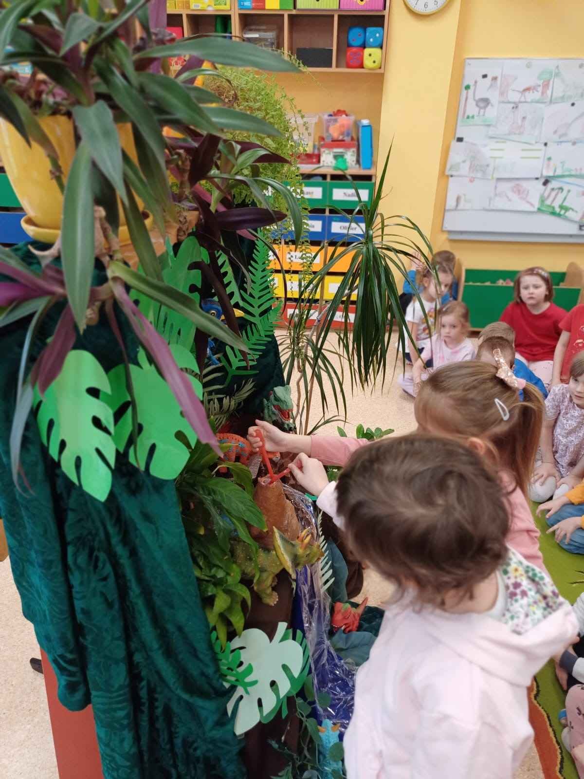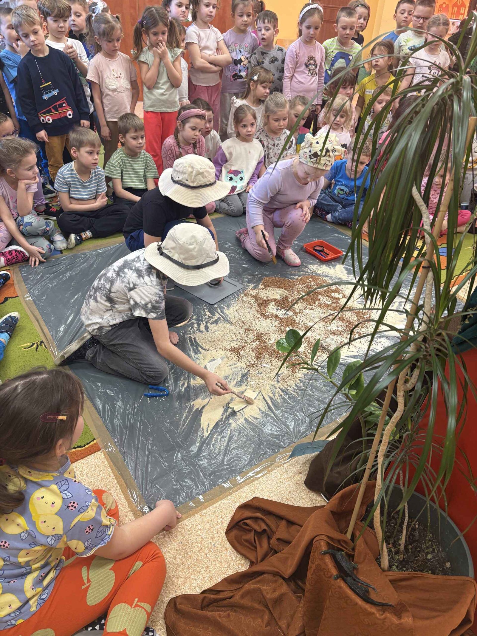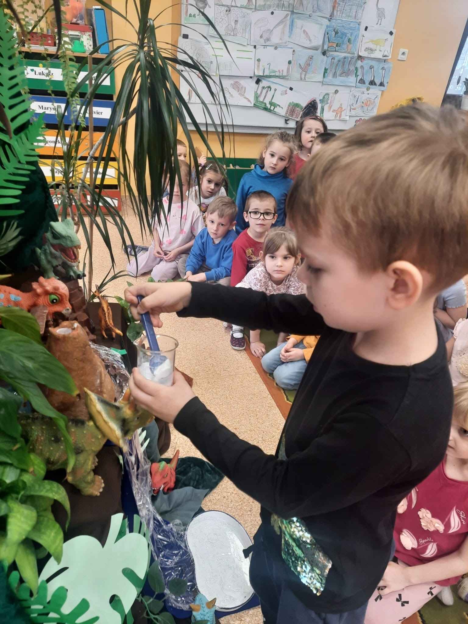 Dużym przeżyciem był pokaz wybuchającego wulkanu, przygotowany w formie prostego eksperymentu naukowego. Dzieci z zainteresowaniem obserwowały reakcję, dzięki której z krateru wypłynęła „lawa”. Była to doskonała okazja do rozmów o zjawiskach przyrodniczych oraz o tym, jak zmieniała się Ziemia na przestrzeni milionów lat.