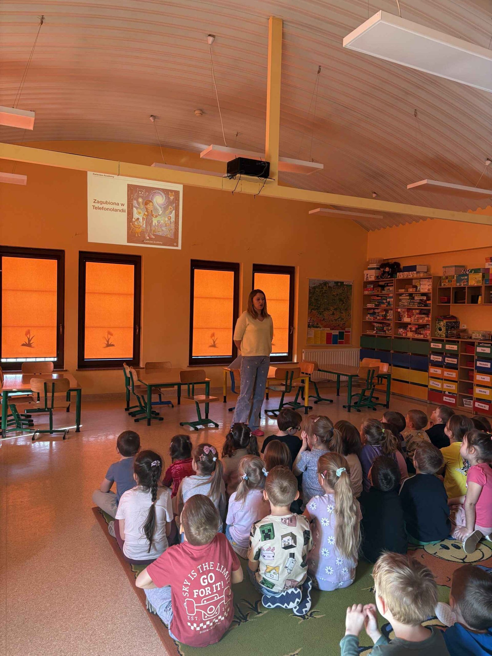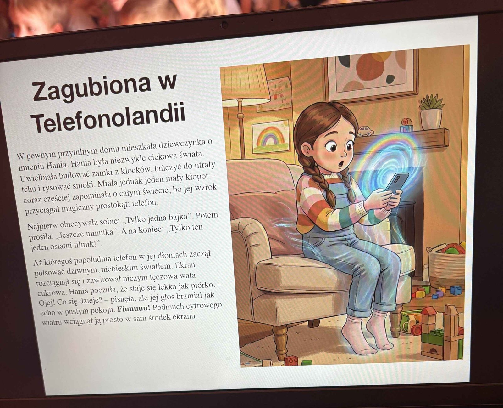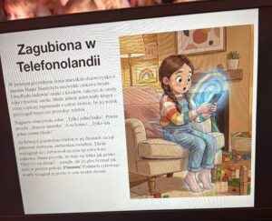Podczas zajęć przedszkolaki wysłuchały bajki terapeutycznej „Zagubiona w Telefonolandii”, która w przystępny i ciekawy sposób opowiada o dziewczynce zbyt długo korzystającej z telefonu oraz o tym, jak ważne są zabawa, ruch i kontakt z innymi ludźmi. Historia stała się punktem wyjścia do rozmowy z dziećmi na temat czasu spędzanego przed ekranem oraz tego, jak można spędzać czas w ciekawy i aktywny sposób.