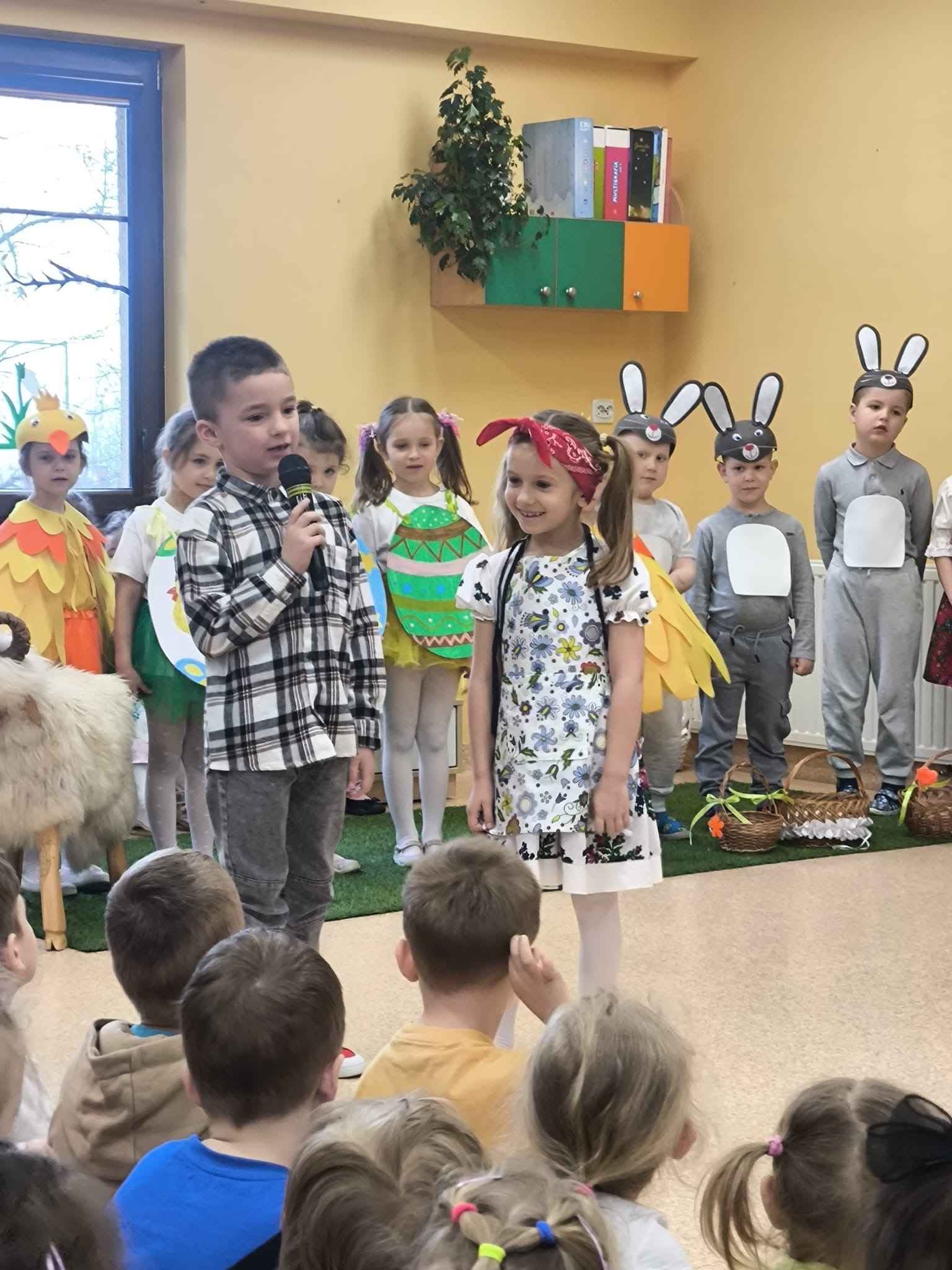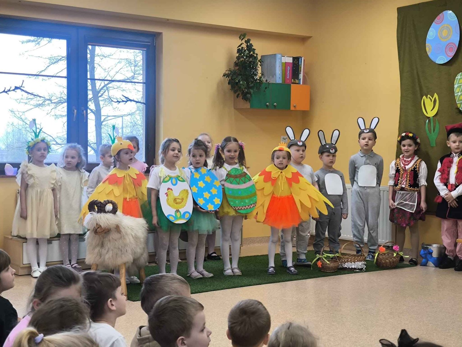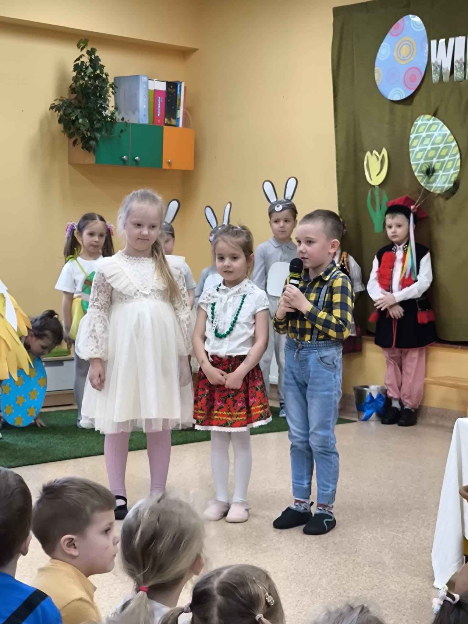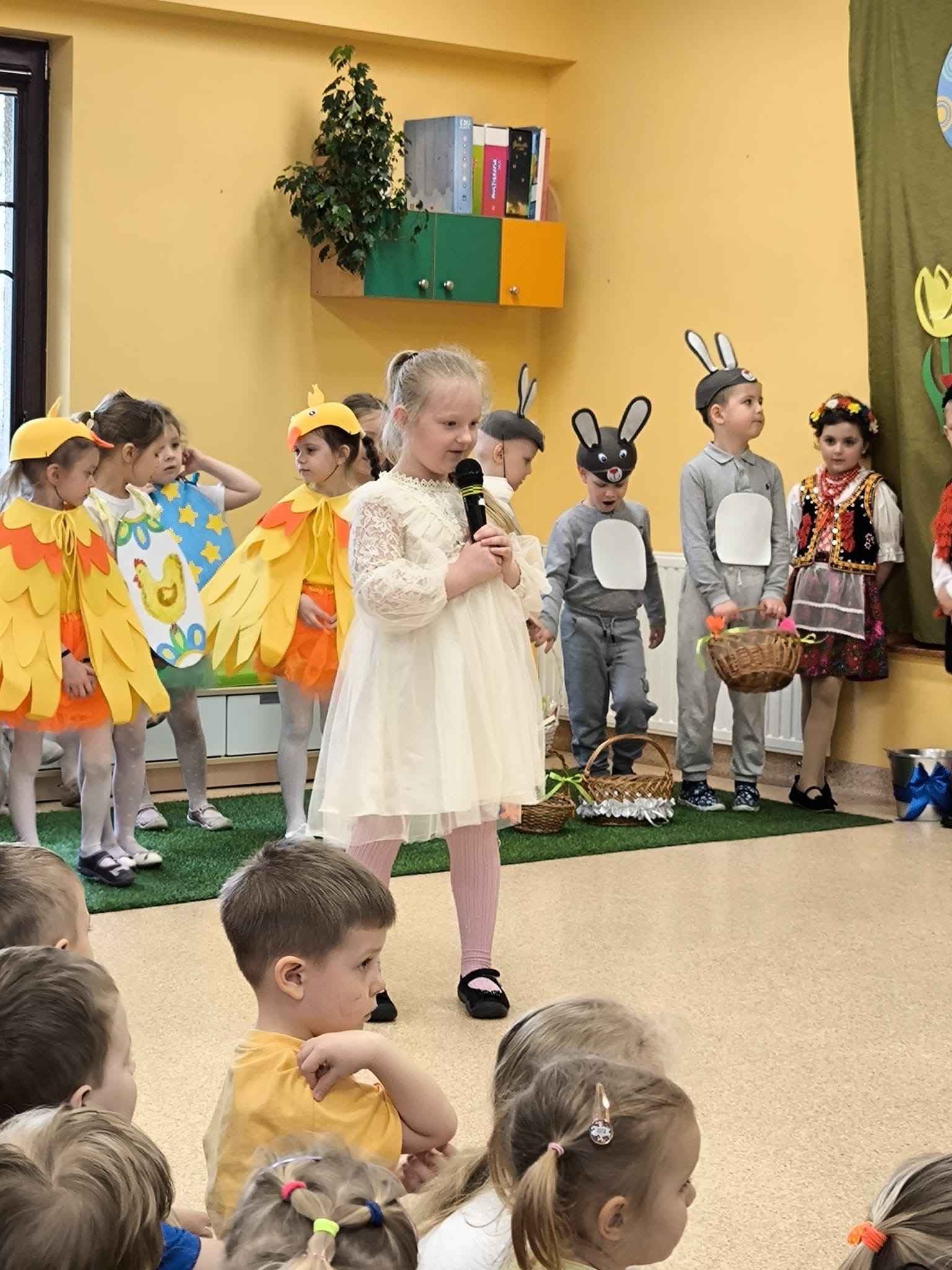 Mali artyści wystąpili w kolorowych strojach, nawiązujących do tradycji wielkanocnych – nie zabrakło zajączków, kurczaczków i barwnych pisanek. Ich występy wzbudziły wiele uśmiechu i wzruszeń wśród zgromadzonych gości. Dzieci z wielką radością dzieliły się swoją energią i entuzjazmem, przypominając wszystkim, jak piękne i ważne są świąteczne tradycje.