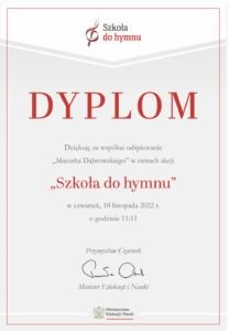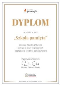 Biuro Ministra Ministerstwa Edukacji i Nauki w imieniu Ministra Edukacji i Nauki Przemysława Czarnka przesłało podziękowania dla naszego przedszkola za udział w akcji „Szkoła pamięta”. W tegorocznej inicjatywie wzięło udział ponad 11 tys. przedszkoli, szkół i placówek oświatowych